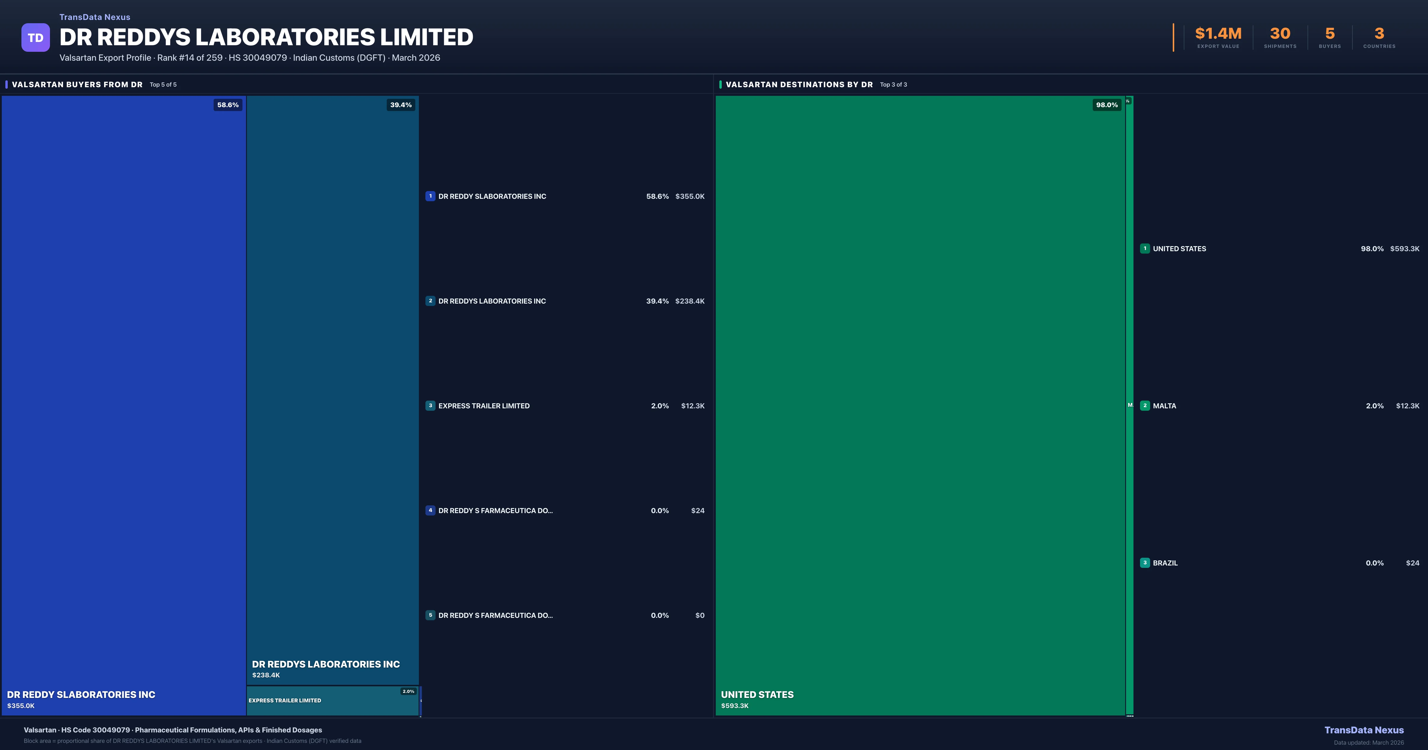 DR Reddys Laboratories Limited supplies Valsartan to 5 buyers globally. The largest buyer is DR REDDY SLABORATORIES INC (UNITED STATES), followed by DR REDDYS LABORATORIES INC (UNITED STATES) and EXPRESS TRAILER LIMITED (MALTA). These buyers represent pharmaceutical distributors, hospital groups, and government procurement agencies in their respective markets.