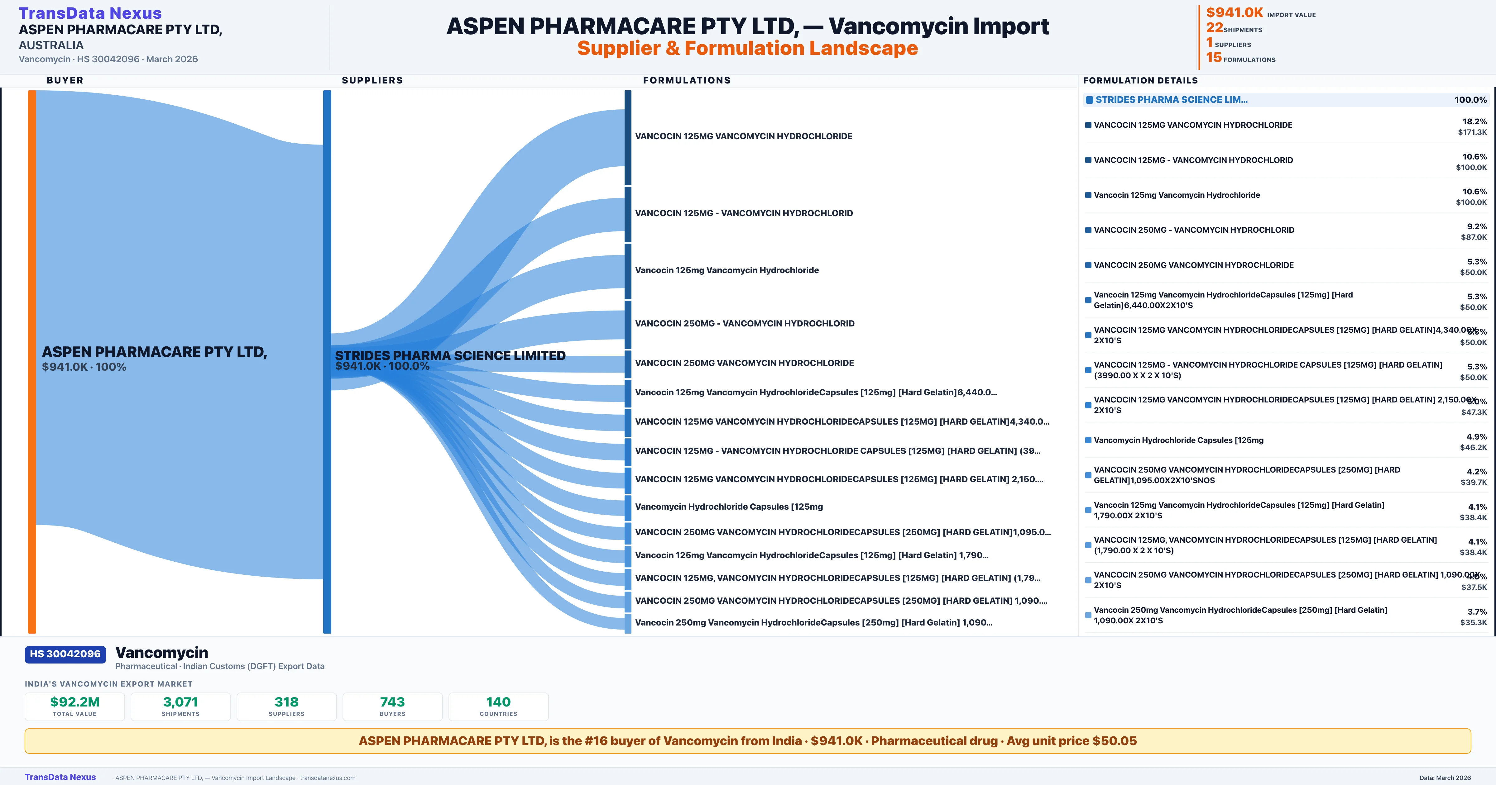 Access order-level details, pricing data, supplier connections, and competitive analysis for ASPEN PHARMACARE PTY LTD,'s Vancomycin imports. TransData Nexus provides verified Indian Customs (DGFT) data trusted by pharmaceutical trade professionals worldwide.