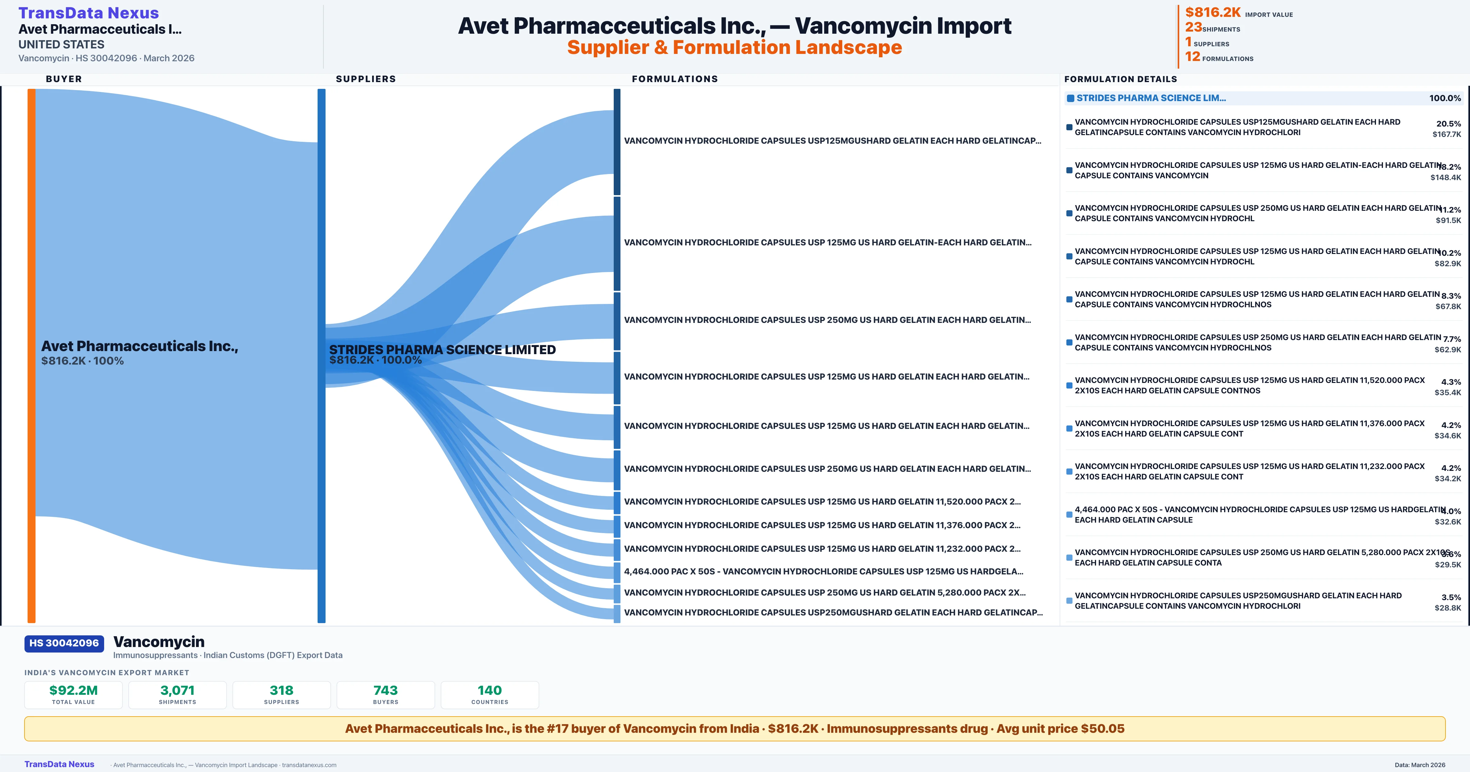 AVET PHARMACCEUTICALS INC., sources Vancomycin from 1 verified Indian supplier: STRIDES PHARMA SCIENCE LIMITED ($816.2K, 100.0%). This is based on 23 customs records.