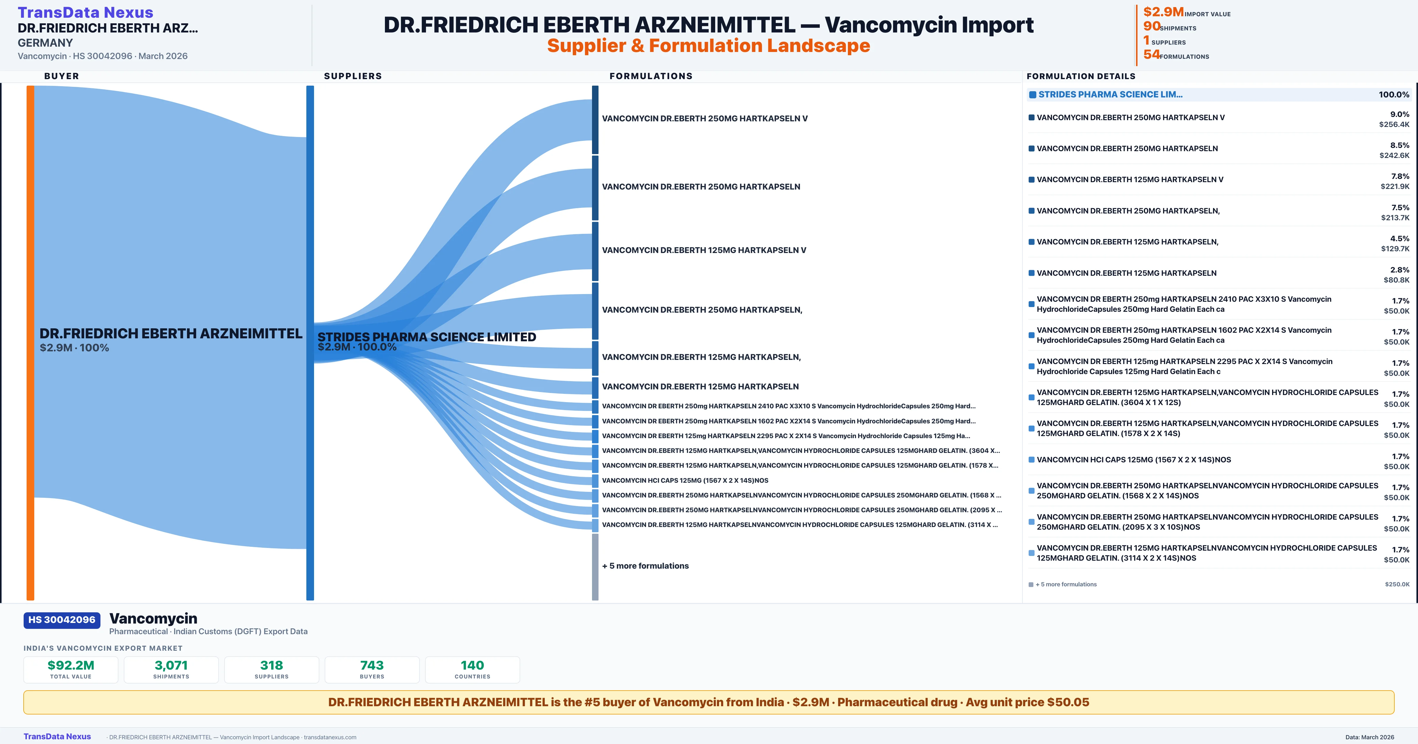 DR.FRIEDRICH EBERTH ARZNEIMITTEL sources Vancomycin from 1 verified Indian supplier: STRIDES PHARMA SCIENCE LIMITED ($2.9M, 100.0%). This is based on 90 customs records.
