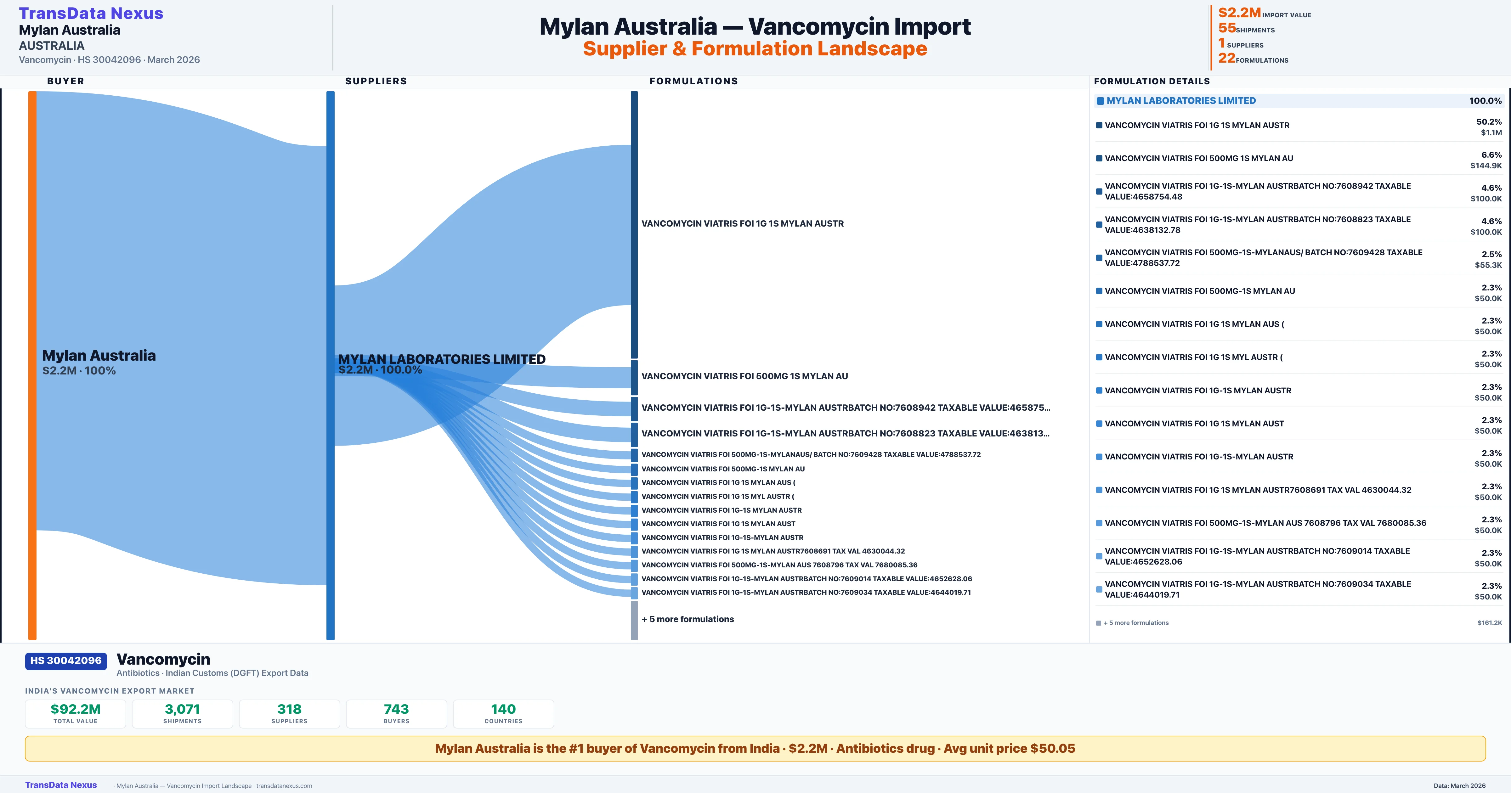 MYLAN AUSTRALIA sources Vancomycin from 1 verified Indian supplier: MYLAN LABORATORIES LIMITED ($2.2M, 100.0%). This is based on 55 customs records.