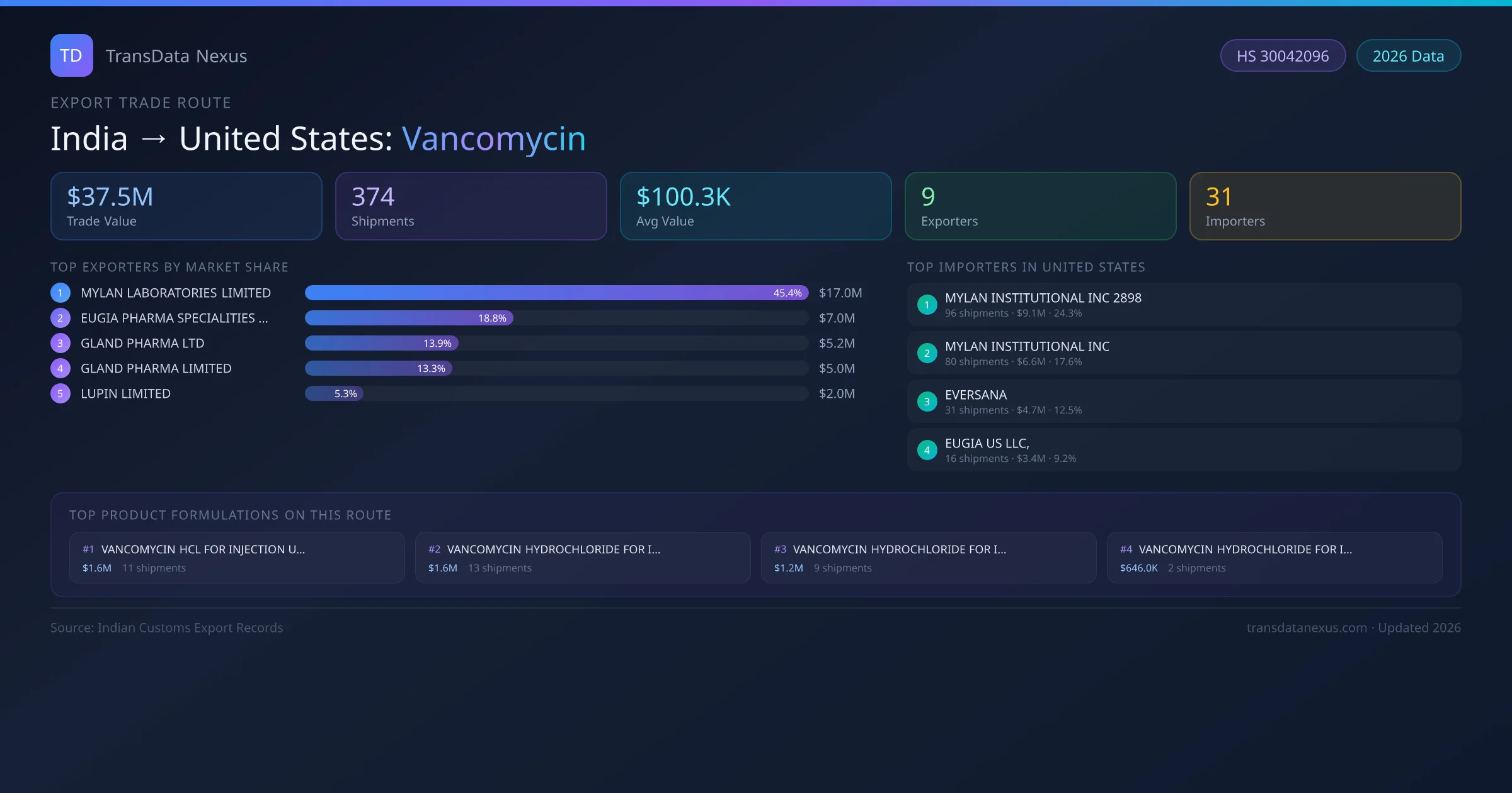 The India to United States Vancomycin corridor is one of India's established pharmaceutical export routes, with 374 shipments documented worth a combined $37.5M USD. The route is dominated by MYLAN LABORATORIES LIMITED, which alone accounts for roughly 45% of all export value, reflecting the consolidated nature of India's vancomycin manufacturing sector.
