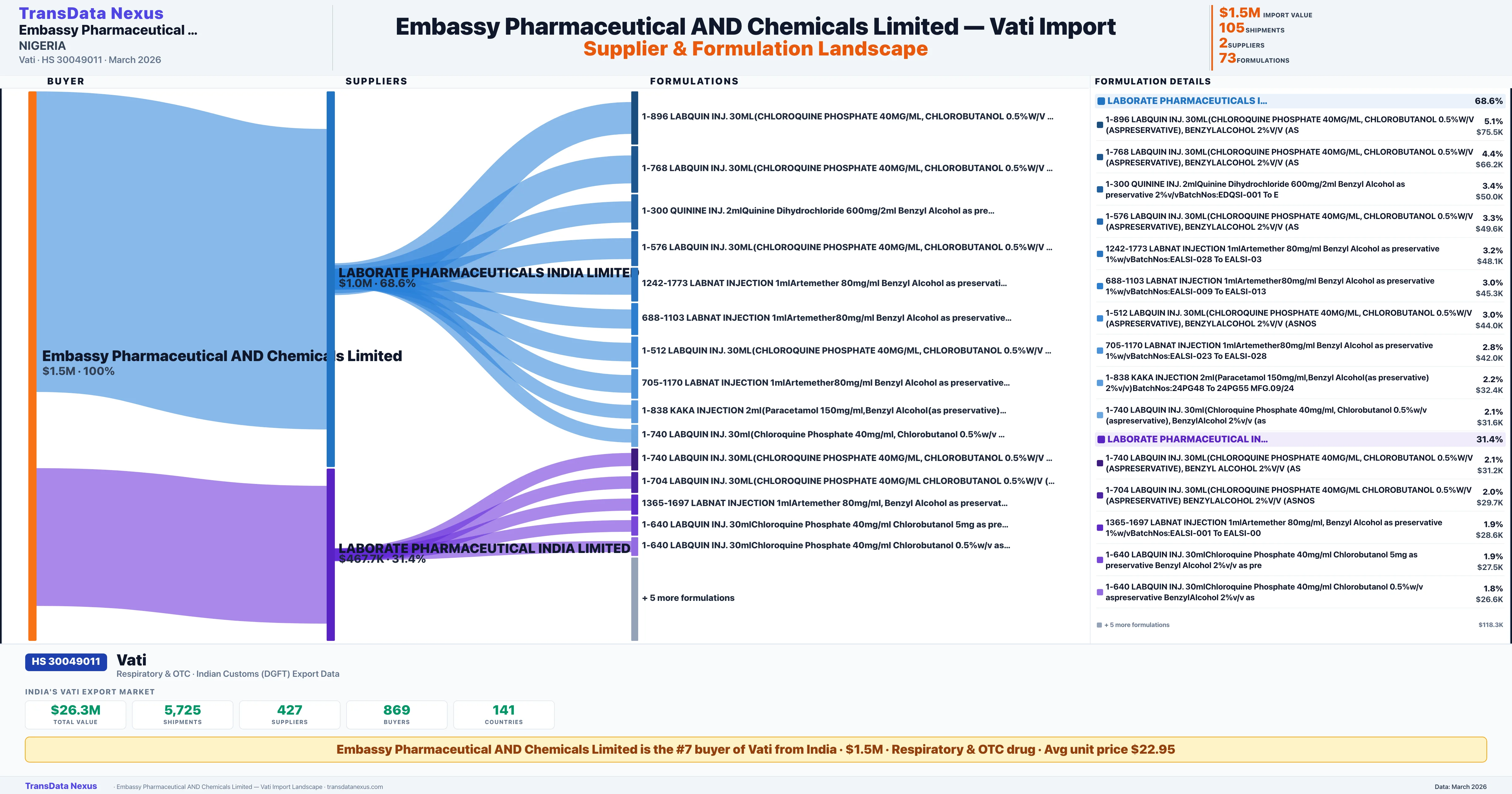 EMBASSY PHARMACEUTICAL AND CHEMICALS LIMITED sources Vati from 2 verified Indian suppliers based on 105 customs records. The primary supplier is LABORATE PHARMACEUTICALS INDIA LIMITED accounting for 68.6% of imports.