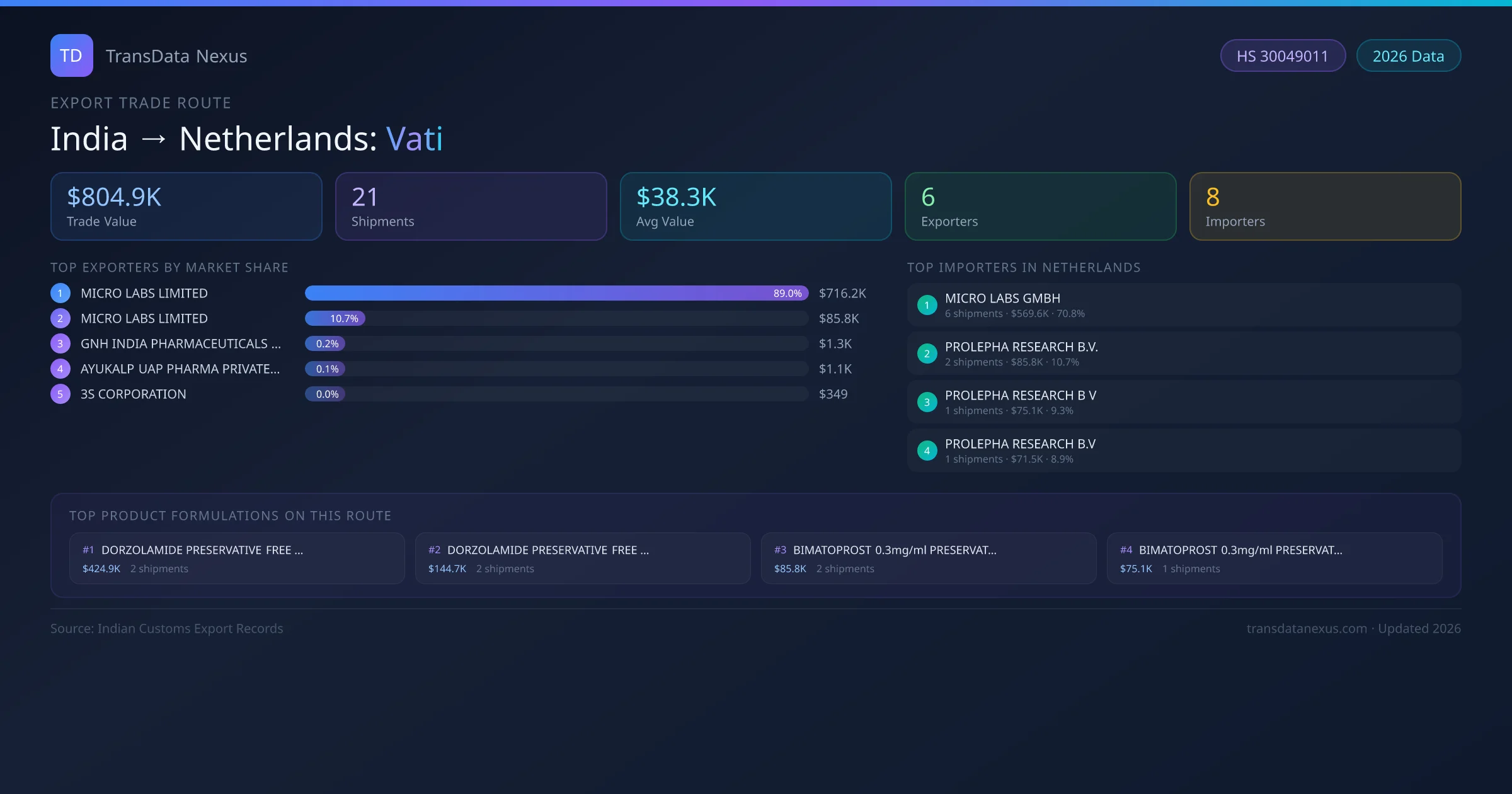 The India to Netherlands Vati corridor is one of India's established pharmaceutical export routes, with 21 shipments documented worth a combined $804.9K USD. The route is dominated by MICRO LABS LIMITED, which alone accounts for roughly 89% of all export value, reflecting the consolidated nature of India's vati manufacturing sector.