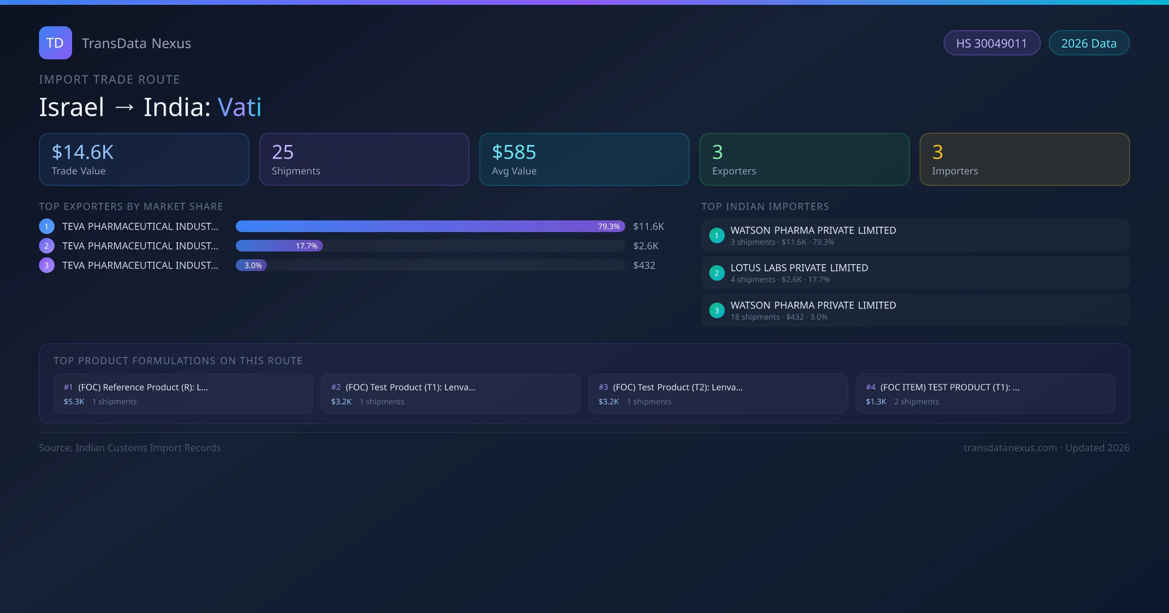 India has recorded 25 verified shipments of Vati imported from Israel, representing a combined trade value of $14.6K USD. This corridor is served by 3 active Israel exporters, with an average shipment value of $585 USD. The leading Israel supplier is TEVA PHARMACEUTICAL INDUSTRIES LTD , which accounts for 79% of total import value with 3 shipments worth $11.6K USD. On the buying side, WATSON PHARMA PRIVATE LIMITED is the largest Indian importer with $11.6K USD in purchases. The top 3 suppliers — TEVA PHARMACEUTICAL INDUSTRIES LTD , TEVA PHARMACEUTICAL INDUSTRIES LTD. , TEVA PHARMACEUTICAL INDUSTRIES LTD — together control 100% of total trade value on this route. All data sourced from Indian Customs (DGFT) shipping bill of entry records. Values reported in FOB USD.