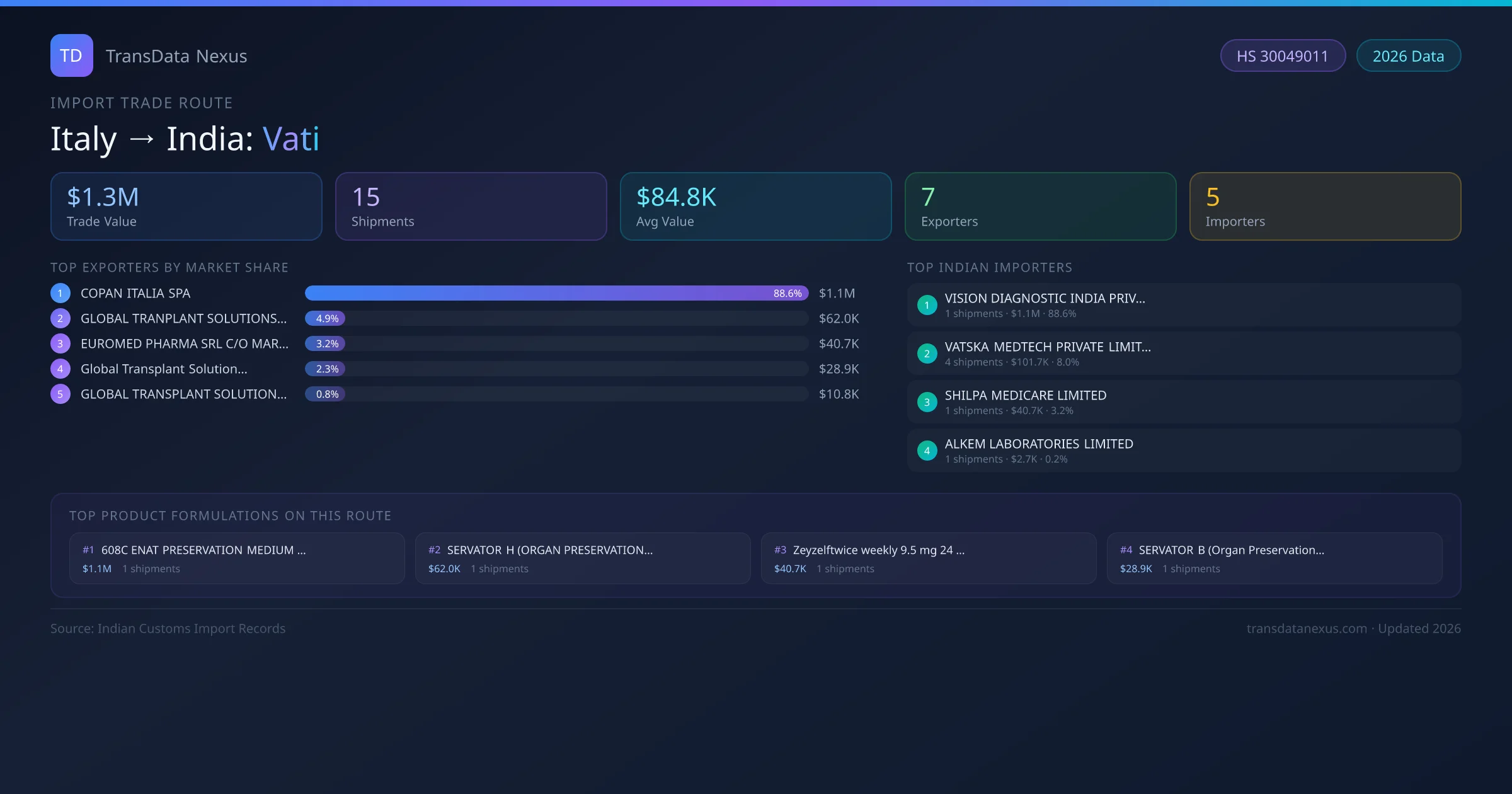 On the receiving end of this trade route, the leading Indian importers of Italy vati include VISION DIAGNOSTIC INDIA PRIVATE LIMITED , VATSKA MEDTECH PRIVATE LIMITED , SHILPA MEDICARE LIMITED , ALKEM LABORATORIES LIMITED, LAXAI LIFE SCIENCES PRIVATE LIMITED . The largest importer is VISION DIAGNOSTIC INDIA PRIVATE LIMITED , accounting for $1.1M USD across 1 shipments — representing 89% of all vati imports from Italy on this route.