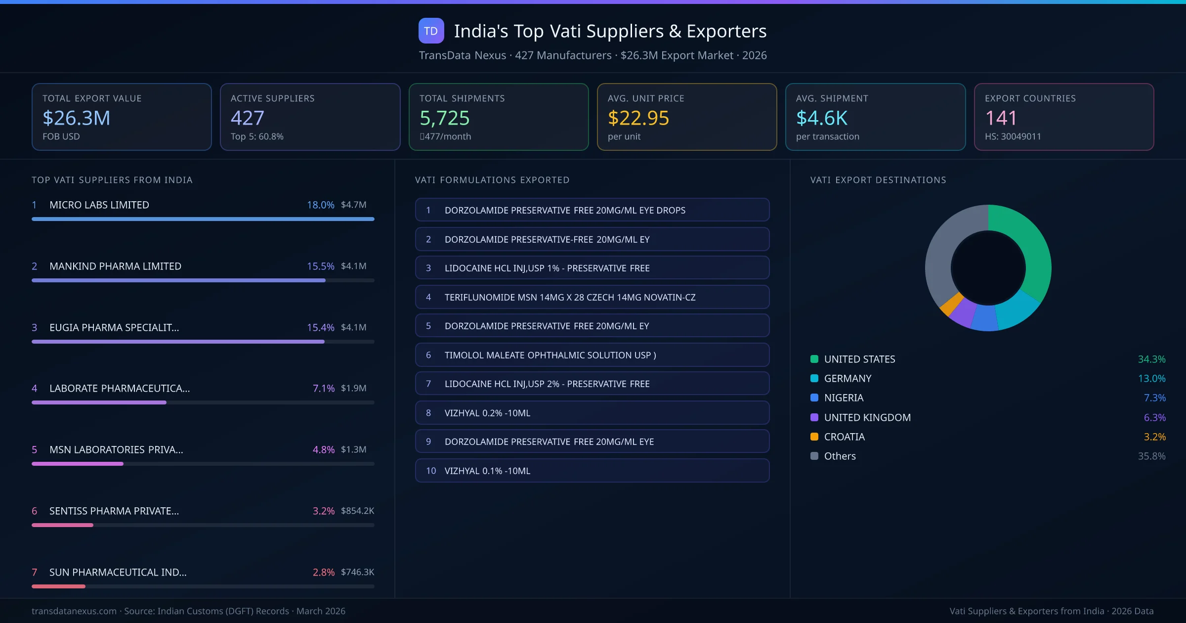 MICRO LABS LIMITED is the leading vati exporter from India, holding a 18.0% share of the $26.3M market across 5,725 shipments from 427 exporters. The top 5 suppliers โ MICRO LABS LIMITED, MANKIND PHARMA LIMITED, EUGIA PHARMA SPECIALITIES LIMITED, LABORATE PHARMACEUTICALS INDIA LTD, MSN LABORATORIES PRIVATE LIMITED โ collectively control 60.8% of total export value, indicating a moderately concentrated market. Individual shares are: MICRO LABS LIMITED (18.0%), MANKIND PHARMA LIMITED (15.5%), EUGIA PHARMA SPECIALITIES LIMITED (15.4%), LABORATE PHARMACEUTICALS INDIA LTD (7.1%), MSN LABORATORIES PRIVATE LIMITED (4.8%).