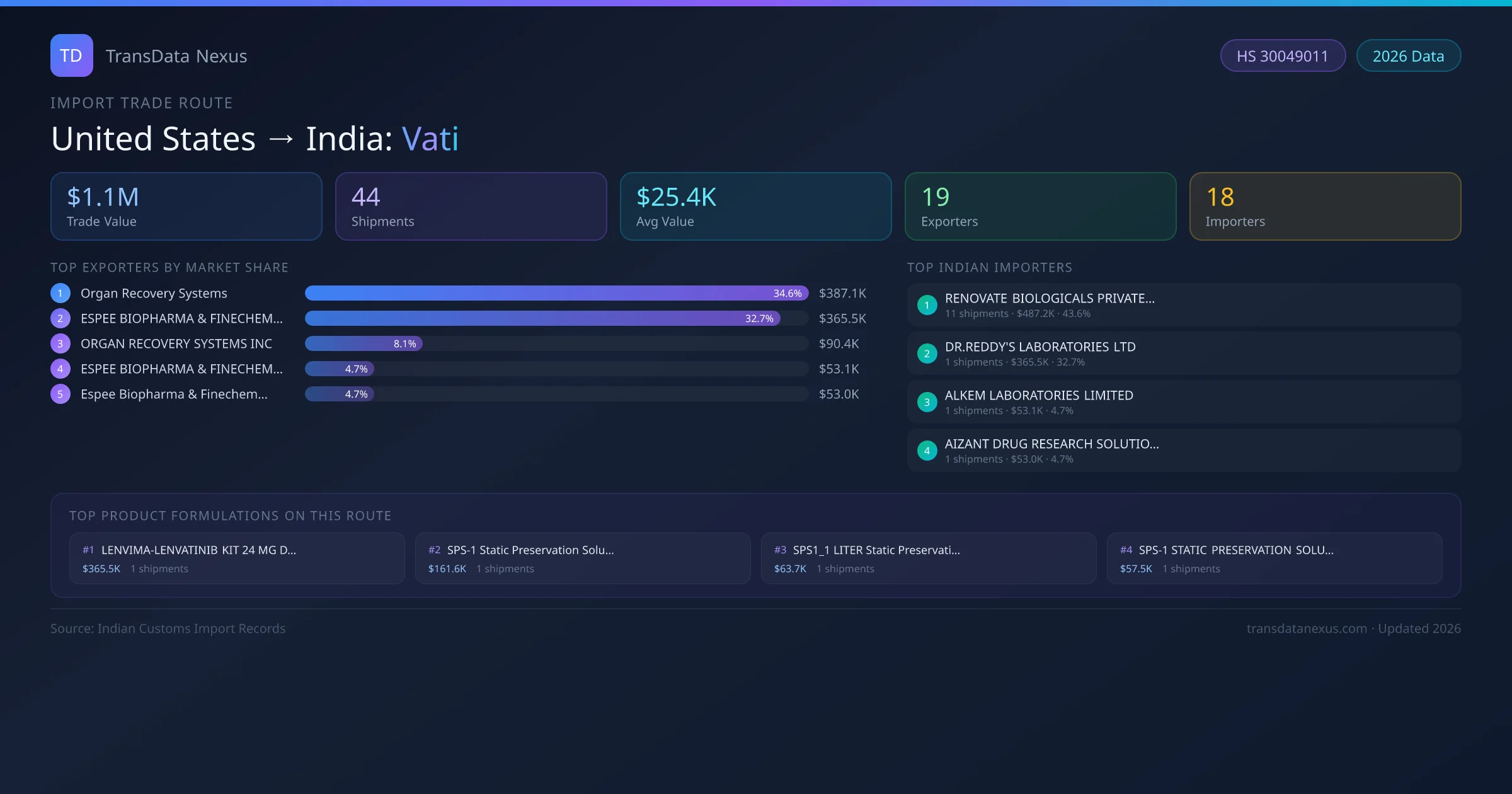 The United States to India Vati corridor is one of India's established pharmaceutical import routes from United States, with 44 shipments documented worth a combined $1.1M USD. The route is dominated by Organ Recovery Systems, which alone accounts for roughly 35% of all import value, reflecting the consolidated nature of United States's vati export sector.