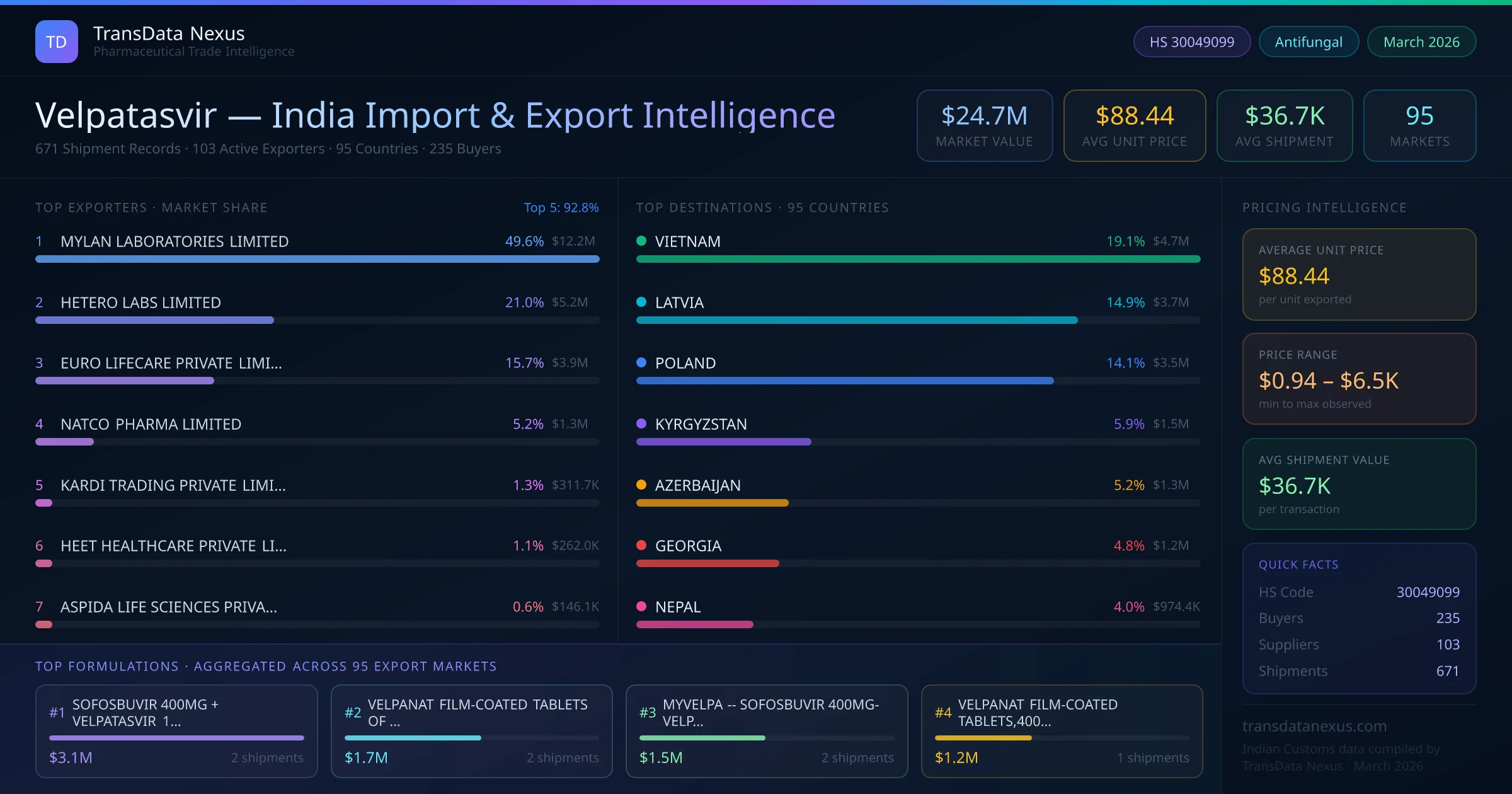 Between 2022 and 2026, India exported $24.7M worth of velpatasvir across 671 verified shipments to 95 countries — covering 49% of world markets in the Antiviral & HIV Medications segment. The largest destination is VIETNAM (19.1%). MYLAN LABORATORIES LIMITED leads with a 49.6% share. All figures are drawn from Indian Customs (DGFT) shipping bill records spanning four years of trade activity.