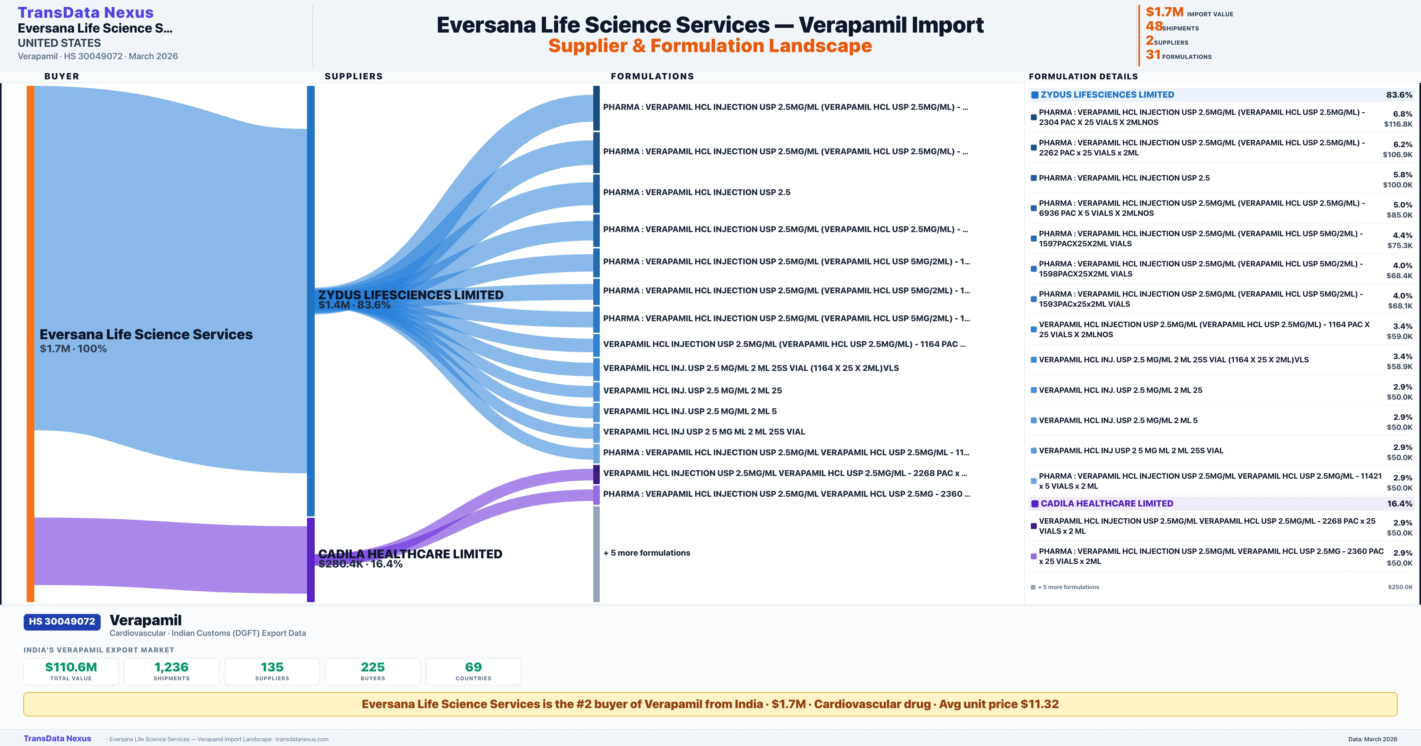 EVERSANA LIFE SCIENCE SERVICES sources Verapamil from 2 verified Indian suppliers: ZYDUS LIFESCIENCES LIMITED ($1.4M, 83.6%), CADILA HEALTHCARE LIMITED ($280.4K, 16.4%). This is based on 48 customs records.