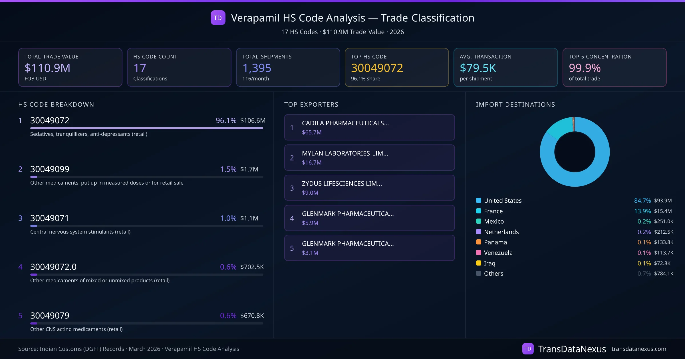 Verapamil, classified under HS code 30049072, is subject to varying Most Favored Nation (MFN) tariff rates across key importing countries. In the United States, pharmaceuticals under HS 3004 generally benefit from a zero MFN tariff rate, facilitating cost-effective imports. Similarly, the European Union, encompassing France and the Netherlands, applies a zero MFN tariff rate to products under HS 3004, promoting seamless trade within the bloc. Mexico, as a member of the World Trade Organization (WTO), also maintains a zero MFN tariff rate for pharmaceuticals under this classification.