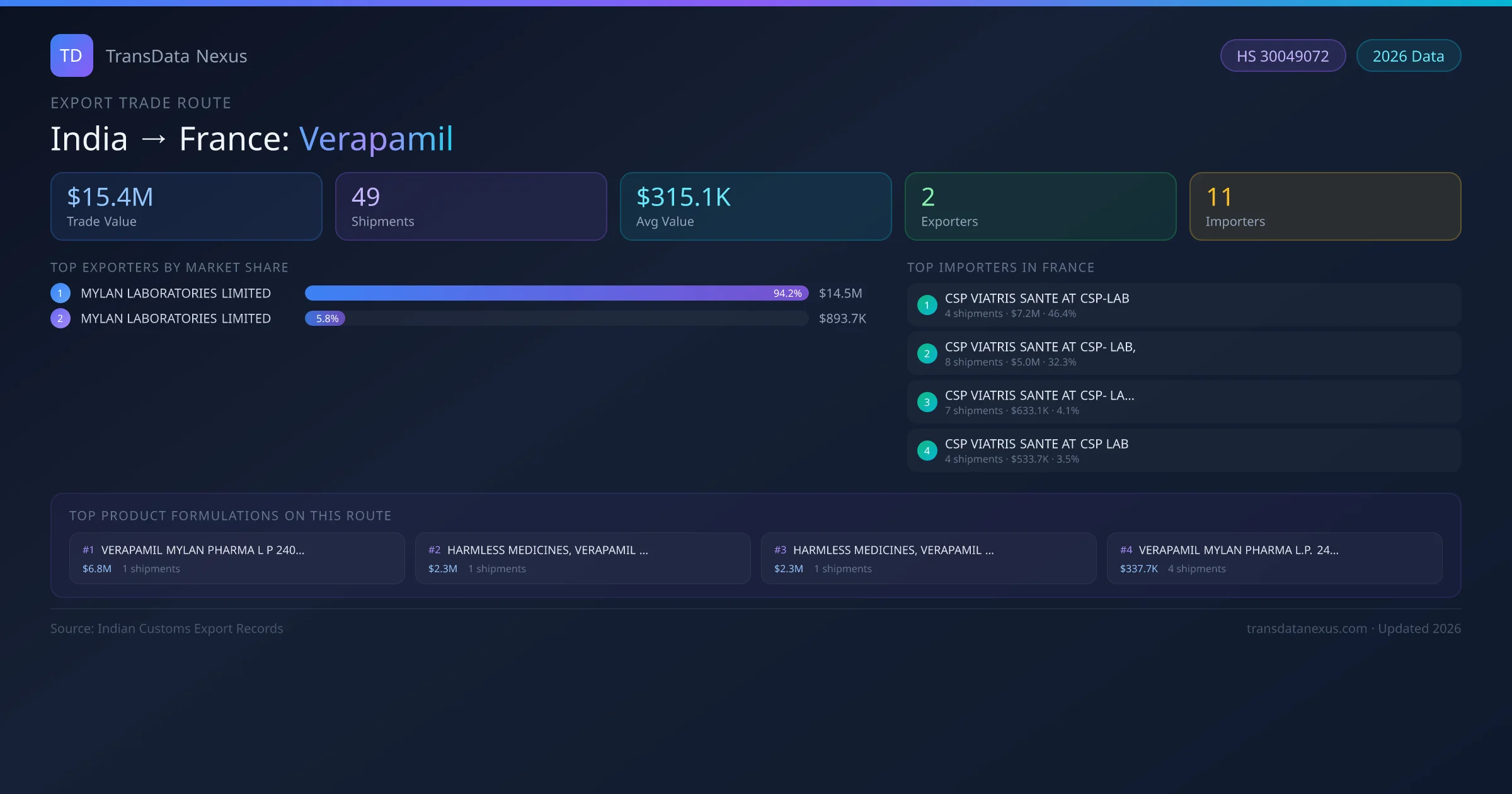 On the buying side, CSP VIATRIS SANTE AT CSP-LAB is the largest importer with 4 shipments worth $7.2M USD — representing 46% of all verapamil imports from India on this route. A total of 11 buyers are active on this corridor.