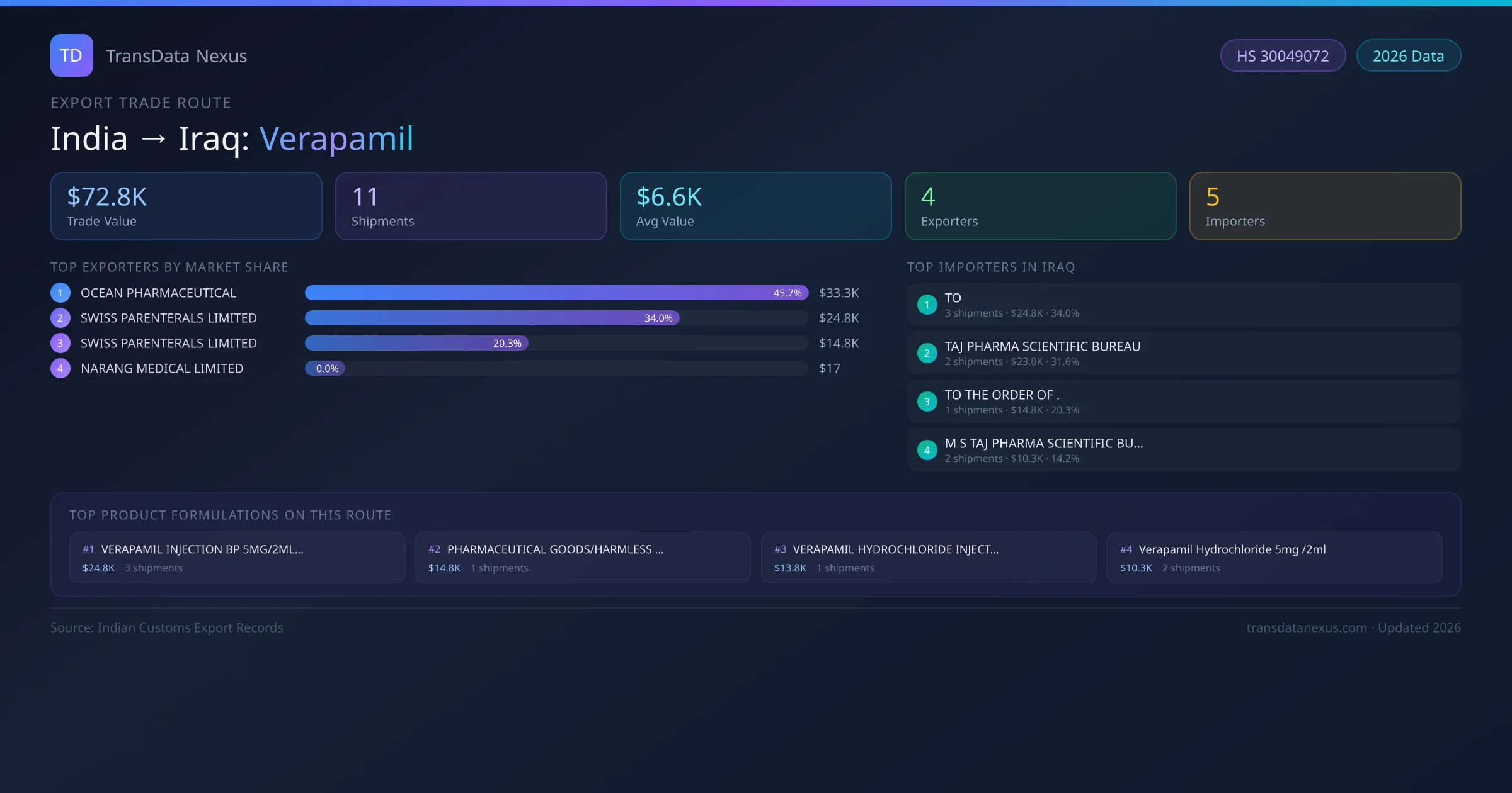 The India to Iraq Verapamil corridor is one of India's established pharmaceutical export routes, with 11 shipments documented worth a combined $72.8K USD. The route is dominated by OCEAN PHARMACEUTICAL, which alone accounts for roughly 46% of all export value, reflecting the consolidated nature of India's verapamil manufacturing sector.