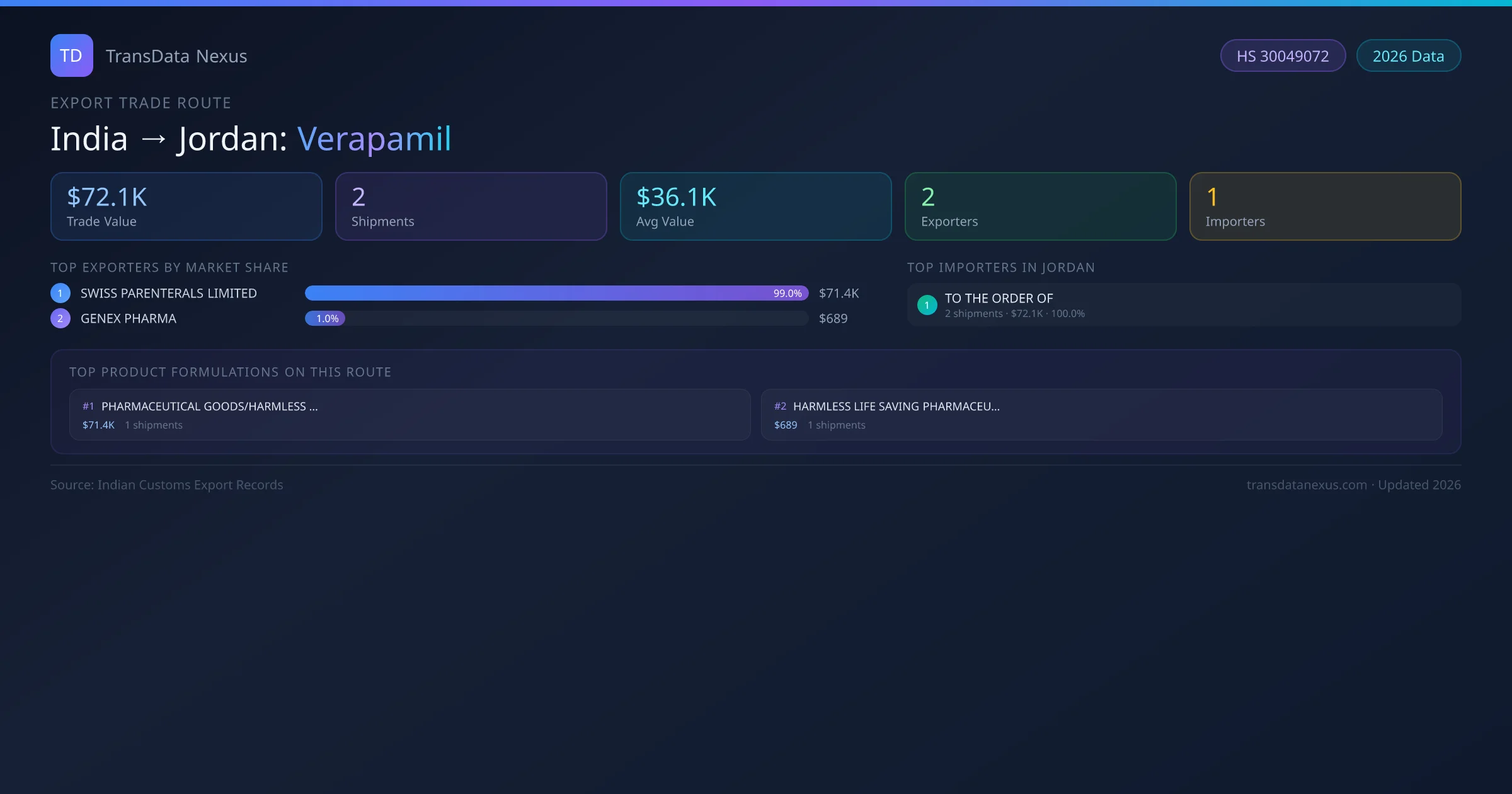 The India to Jordan Verapamil corridor is one of India's established pharmaceutical export routes, with 2 shipments documented worth a combined $72.1K USD. The route is dominated by SWISS PARENTERALS LIMITED, which alone accounts for roughly 99% of all export value, reflecting the consolidated nature of India's verapamil manufacturing sector.