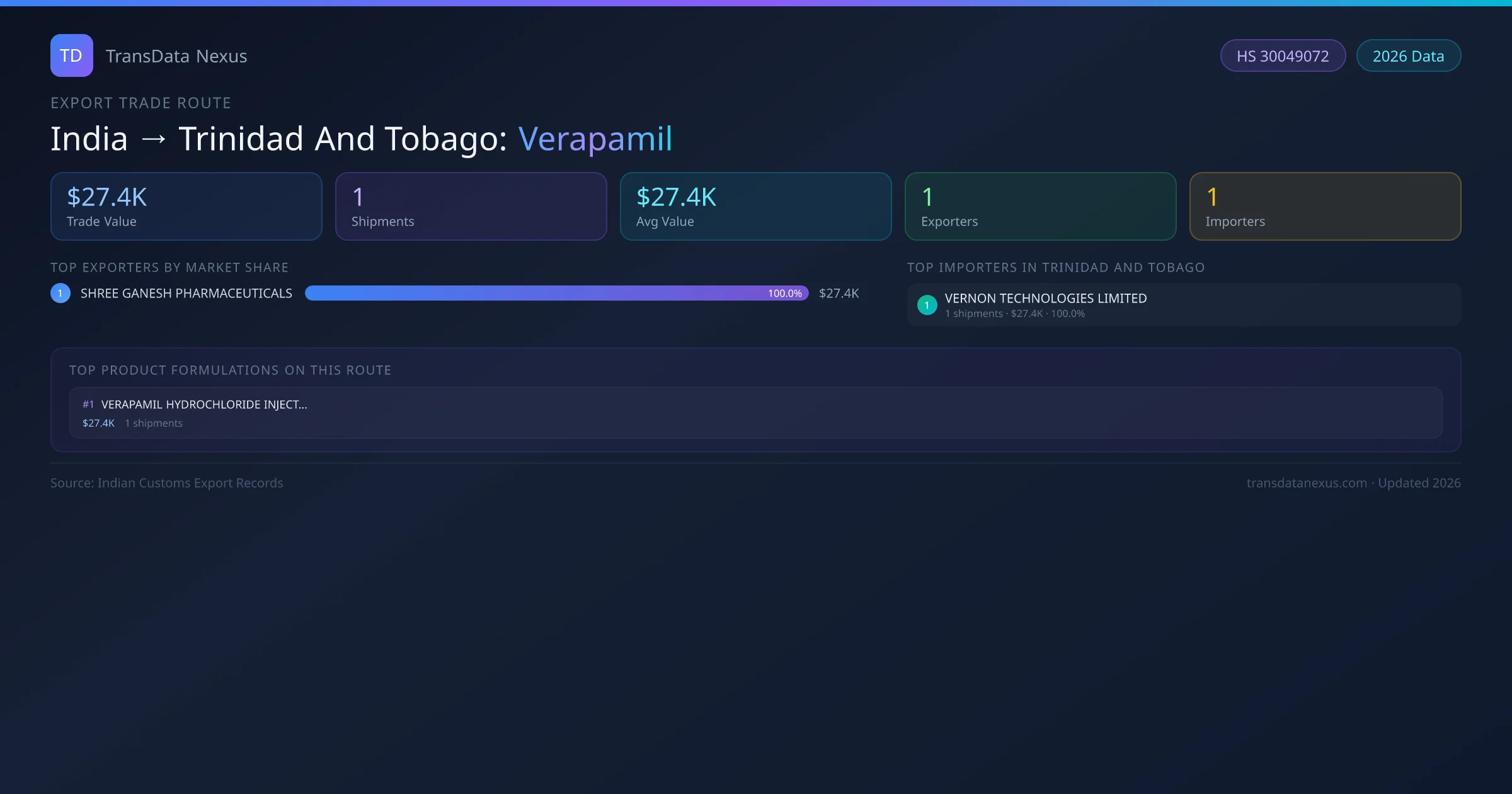 On the receiving end of this trade route, the leading importers of Indian verapamil in Trinidad And Tobago include VERNON TECHNOLOGIES LIMITED. The largest importer is VERNON TECHNOLOGIES LIMITED, accounting for $27.4K USD across 1 shipments — representing 100% of all verapamil imports from India on this route.