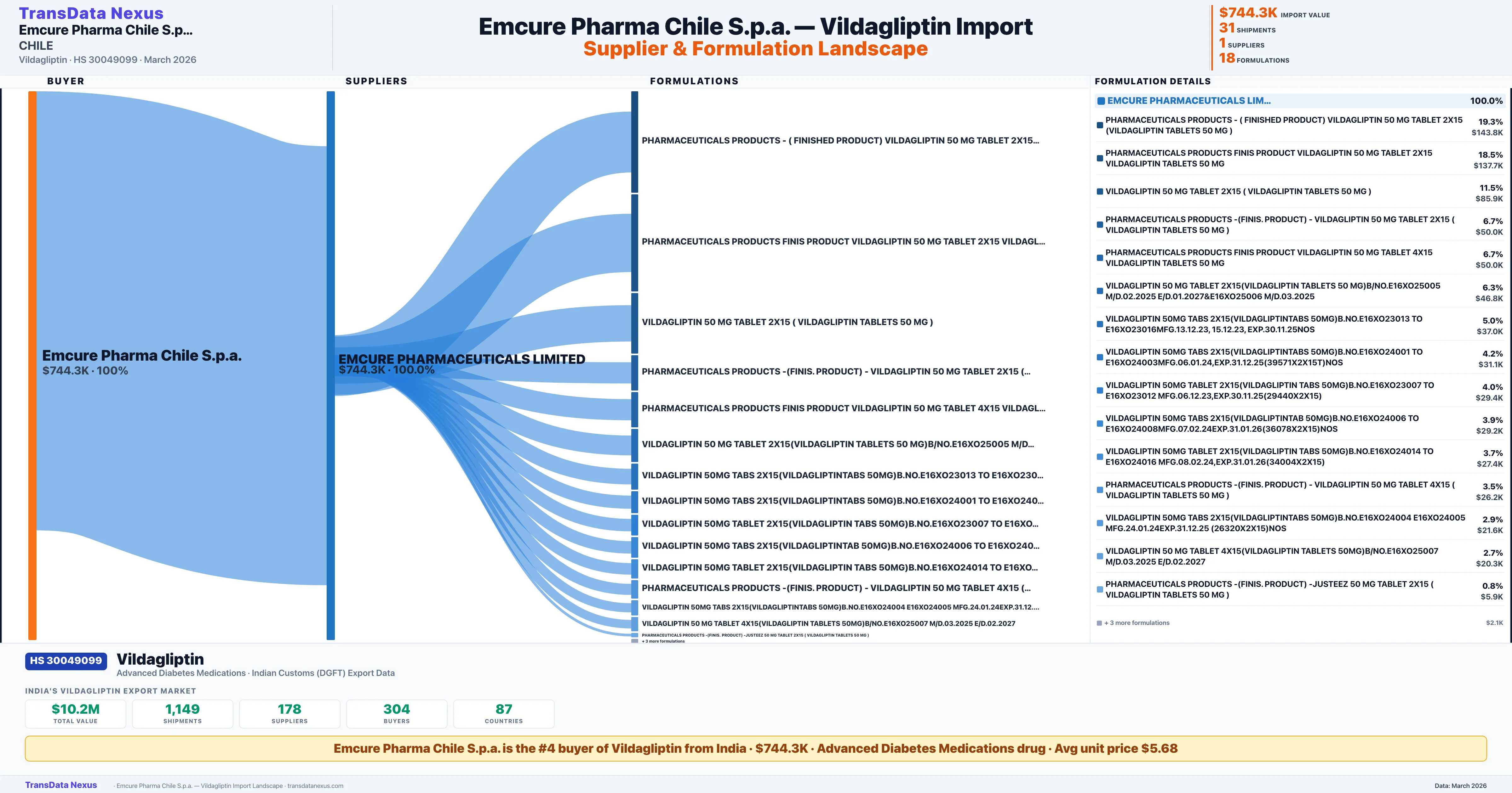 EMCURE PHARMA CHILE S.P.A. sources Vildagliptin from 1 verified Indian supplier: EMCURE PHARMACEUTICALS LIMITED ($744.3K, 100.0%). This is based on 31 customs records.