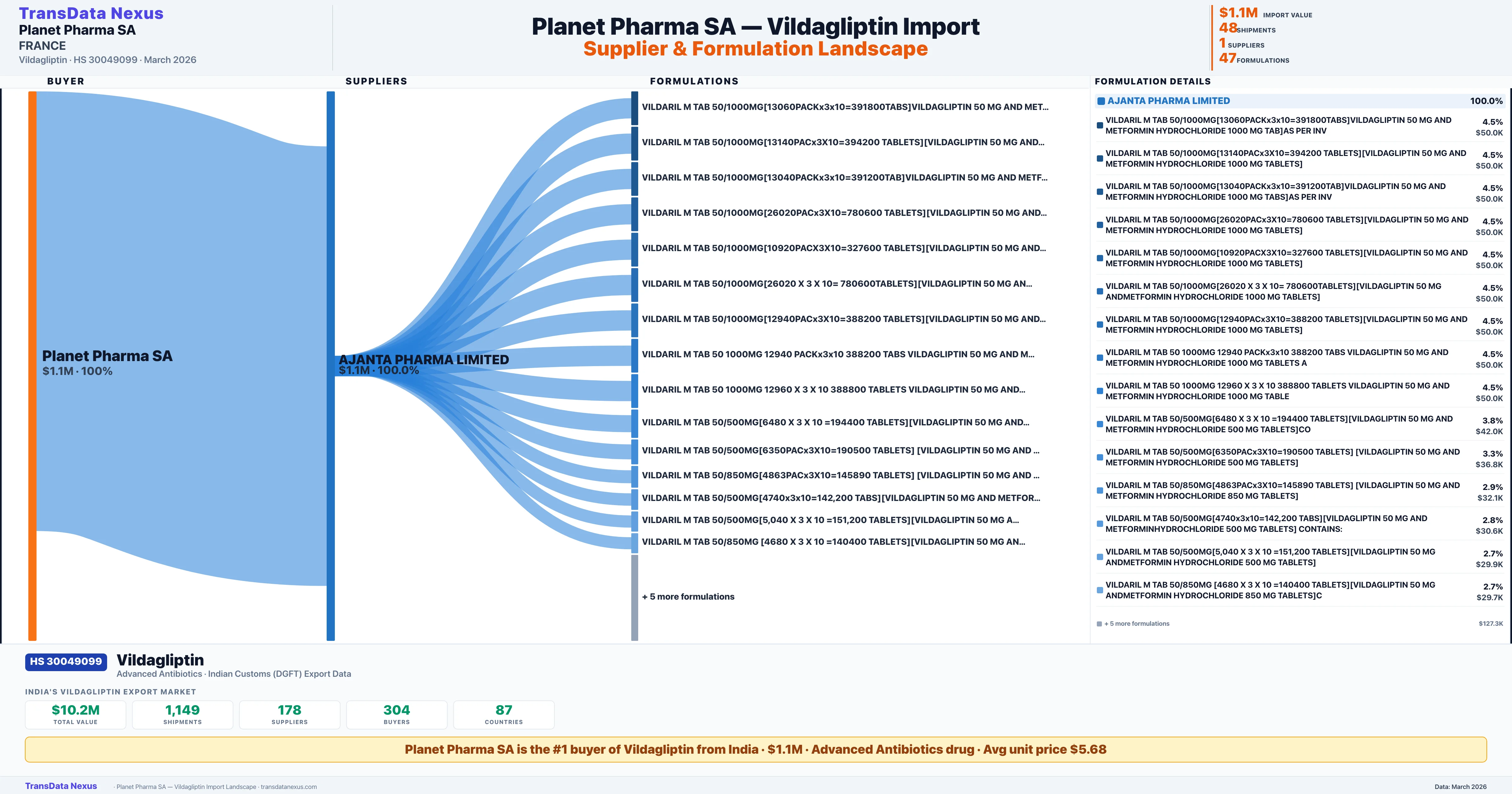 PLANET PHARMA SA sources Vildagliptin from 1 verified Indian supplier: AJANTA PHARMA LIMITED ($1.1M, 100.0%). This is based on 48 customs records.