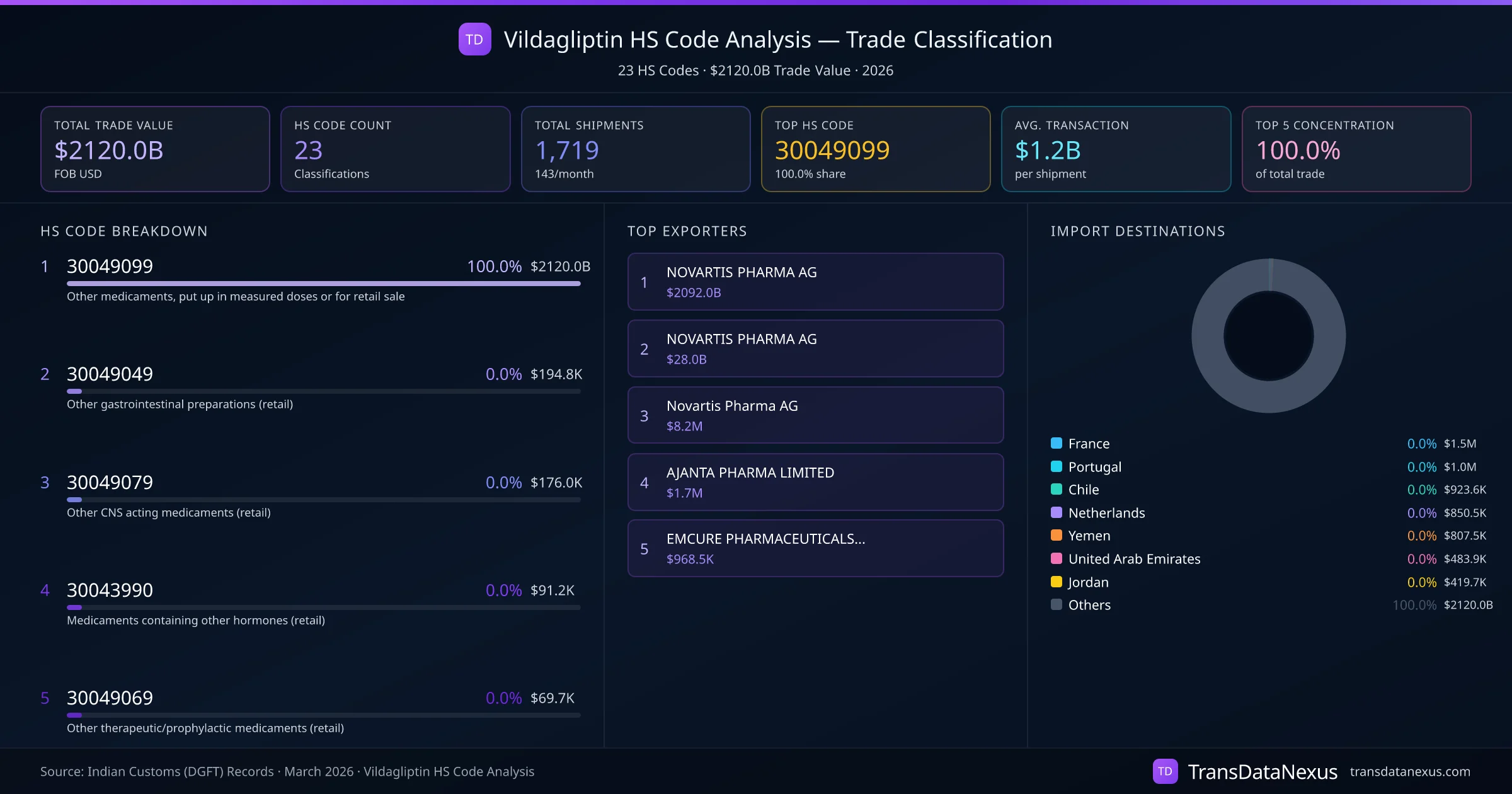 India exports Vildagliptin under 23 distinct HS code classifications, representing a total trade value of $2120.0B across 1,719 shipments. The dominant classification is HS 30049099 (Other medicaments, put up in measured doses or for retail sale), accounting for 100.0% of all Vildagliptin trade at $2120.0B. HS 30049049 (Other gastrointestinal preparations (retail)) follows at 0.0% ($194.8K). The top 5 HS codes together account for 100.0% of total Vildagliptin trade from India. The average transaction value is $1233277425. Key importing markets include France, Portugal, Chile. Leading exporters include NOVARTIS PHARMA AG and NOVARTIS PHARMA AG. Data sourced from Indian Customs (DGFT) shipping bill records.