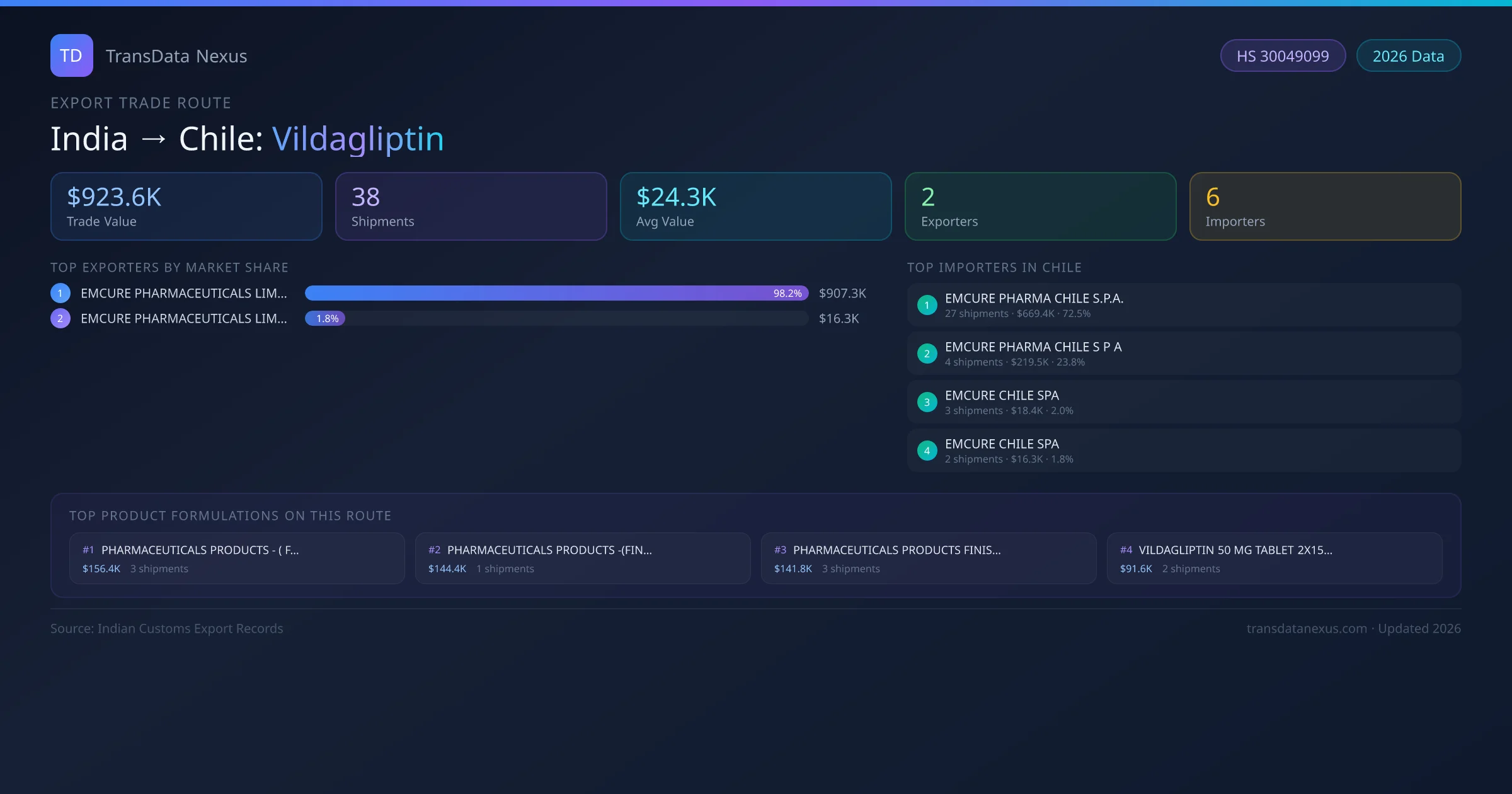 India has recorded 38 verified shipments of Vildagliptin exported to Chile, representing a combined trade value of $923.6K USD. This corridor is served by 2 active Indian exporters, with an average shipment value of $24.3K USD. The leading Indian exporter is EMCURE PHARMACEUTICALS LIMITED, which accounts for 98% of total export value with 35 shipments worth $907.3K USD. On the buying side, EMCURE PHARMA CHILE S.P.A. is the largest importer in Chile with $669.4K USD in purchases. All data sourced from Indian Customs (DGFT) shipping bill records. Values reported in FOB USD.