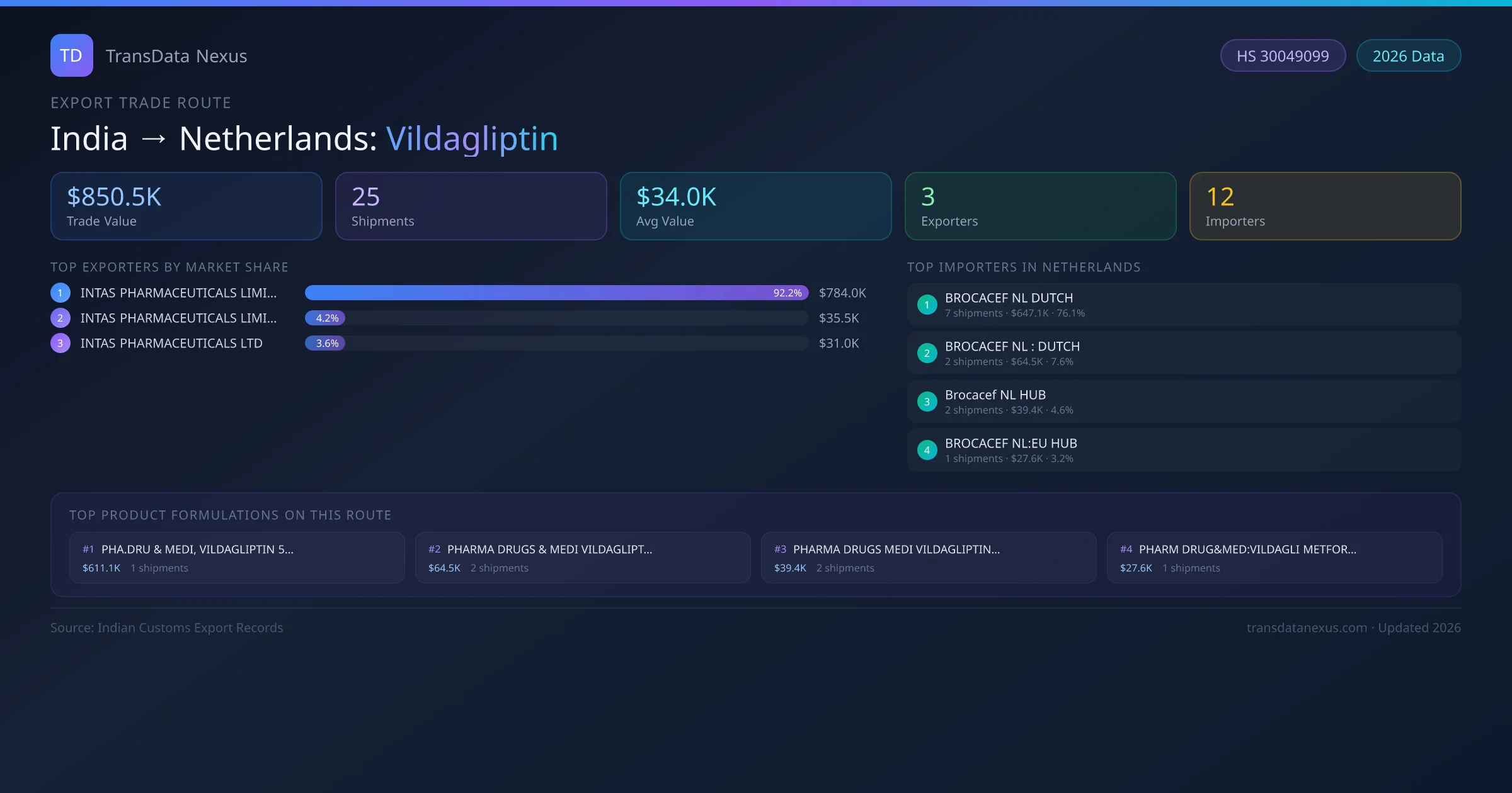 India has recorded 25 verified shipments of Vildagliptin exported to Netherlands, representing a combined trade value of $850.5K USD. This corridor is served by 3 active Indian exporters, with an average shipment value of $34.0K USD. The leading Indian exporter is INTAS PHARMACEUTICALS LIMITED, which accounts for 92% of total export value with 14 shipments worth $784.0K USD. On the buying side, BROCACEF NL DUTCH is the largest importer in Netherlands with $647.1K USD in purchases. The top 3 suppliers — INTAS PHARMACEUTICALS LIMITED, INTAS PHARMACEUTICALS LIMITED , INTAS PHARMACEUTICALS LTD — together control 100% of total trade value on this route. All data sourced from Indian Customs (DGFT) shipping bill records. Values reported in FOB USD.