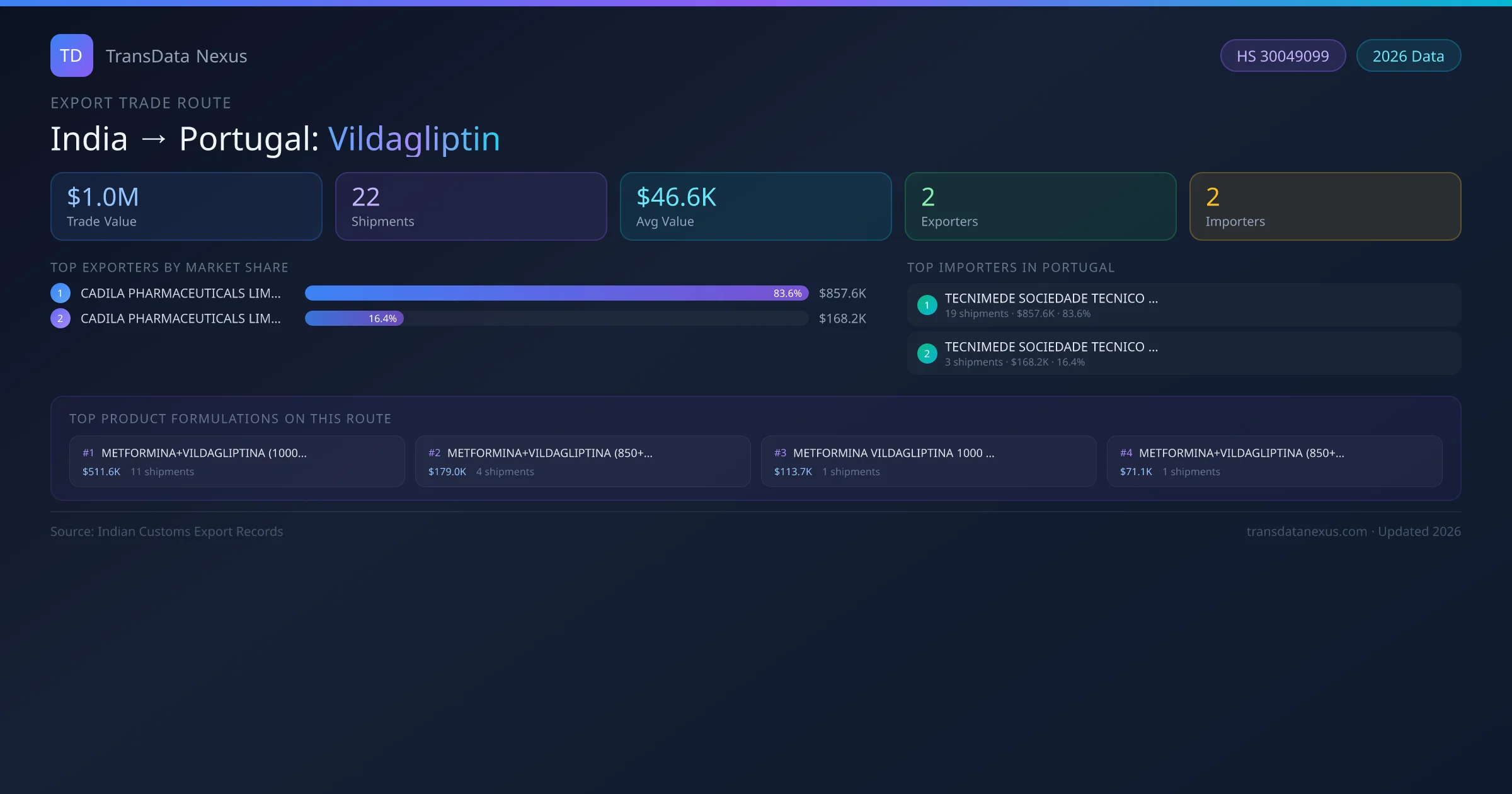 - 1.Route Identification: India to Portugal export trade corridor identified from Indian Customs (DGFT) records for Vildagliptin.