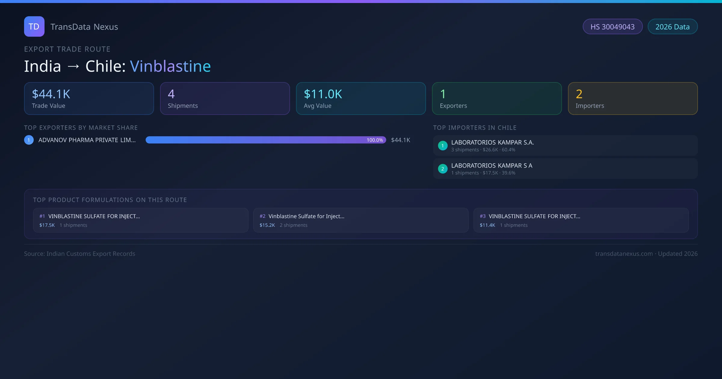 India has recorded 4 verified shipments of Vinblastine exported to Chile, representing a combined trade value of $44.1K USD. This corridor is served by 1 active Indian exporters, with an average shipment value of $11.0K USD. The leading Indian exporter is ADVANOV PHARMA PRIVATE LIMITED, which accounts for 100% of total export value with 4 shipments worth $44.1K USD. On the buying side, LABORATORIOS KAMPAR S.A. is the largest importer in Chile with $26.6K USD in purchases. All data sourced from Indian Customs (DGFT) shipping bill records. Values reported in FOB USD.