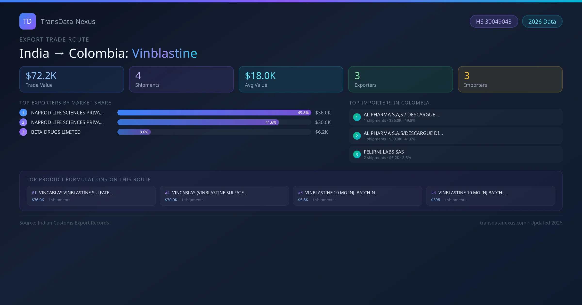 India has recorded 4 verified shipments of Vinblastine exported to Colombia, representing a combined trade value of $72.2K USD. This corridor is served by 3 active Indian exporters, with an average shipment value of $18.0K USD. The leading Indian exporter is NAPROD LIFE SCIENCES PRIVATE LIMITED, which accounts for 50% of total export value with 1 shipments worth $36.0K USD. On the buying side, AL PHARMA S,A,S / DESCARGUE DIRECTO is the largest importer in Colombia with $36.0K USD in purchases. The top 3 suppliers — NAPROD LIFE SCIENCES PRIVATE LIMITED, NAPROD LIFE SCIENCES PRIVATE LIMITED , BETA DRUGS LIMITED — together control 100% of total trade value on this route. All data sourced from Indian Customs (DGFT) shipping bill records. Values reported in FOB USD.