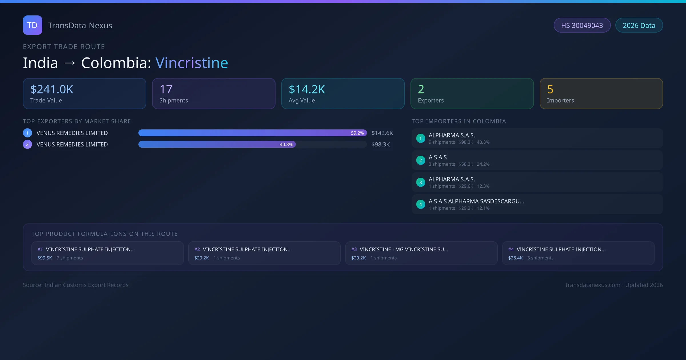 The India to Colombia Vincristine corridor is one of India's established pharmaceutical export routes, with 17 shipments documented worth a combined $241.0K USD. The route is dominated by VENUS REMEDIES LIMITED, which alone accounts for roughly 59% of all export value, reflecting the consolidated nature of India's vincristine manufacturing sector.