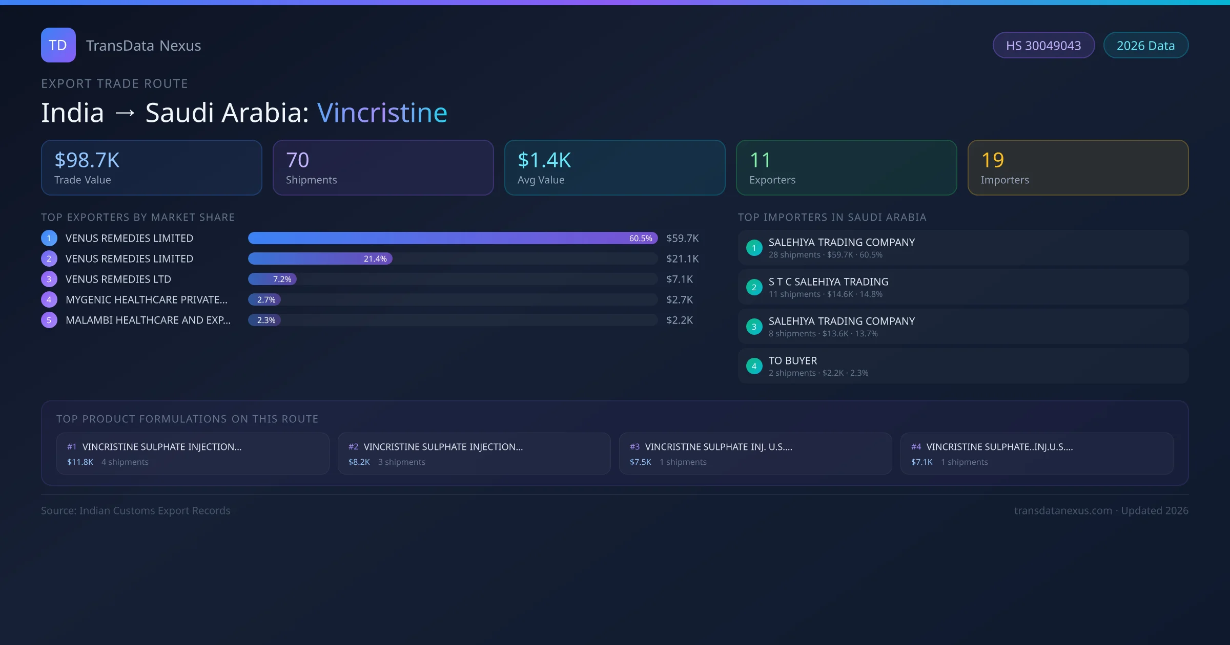 India has recorded 70 verified shipments of Vincristine exported to Saudi Arabia, representing a combined trade value of $98.7K USD. This corridor is served by 11 active Indian exporters, with an average shipment value of $1.4K USD. The leading Indian exporter is VENUS REMEDIES LIMITED , which accounts for 61% of total export value with 28 shipments worth $59.7K USD. On the buying side, SALEHIYA TRADING COMPANY is the largest importer in Saudi Arabia with $59.7K USD in purchases. The top 3 suppliers — VENUS REMEDIES LIMITED , VENUS REMEDIES LIMITED, VENUS REMEDIES LTD — together control 89% of total trade value on this route. All data sourced from Indian Customs (DGFT) shipping bill records. Values reported in FOB USD.