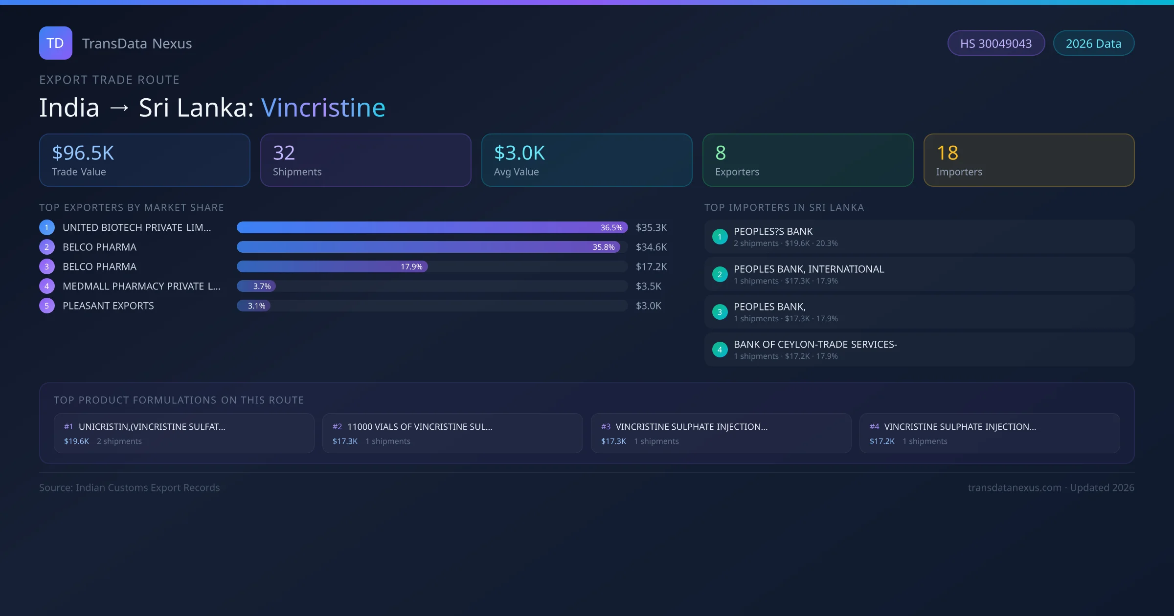 India has recorded 32 verified shipments of Vincristine exported to Sri Lanka, representing a combined trade value of $96.5K USD. This corridor is served by 8 active Indian exporters, with an average shipment value of $3.0K USD. The leading Indian exporter is UNITED BIOTECH PRIVATE LIMITED, which accounts for 37% of total export value with 6 shipments worth $35.3K USD. On the buying side, PEOPLES?S BANK is the largest importer in Sri Lanka with $19.6K USD in purchases. The top 3 suppliers — UNITED BIOTECH PRIVATE LIMITED, BELCO PHARMA , BELCO PHARMA — together control 90% of total trade value on this route. All data sourced from Indian Customs (DGFT) shipping bill records. Values reported in FOB USD.