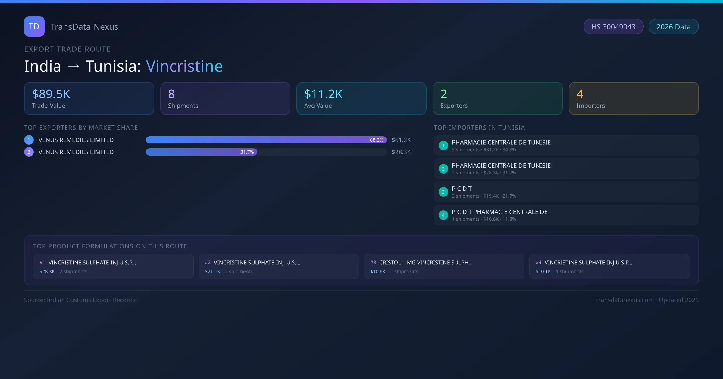The India to Tunisia Vincristine corridor is one of India's established pharmaceutical export routes, with 8 shipments documented worth a combined $89.5K USD. The route is dominated by VENUS REMEDIES LIMITED, which alone accounts for roughly 68% of all export value, reflecting the consolidated nature of India's vincristine manufacturing sector.