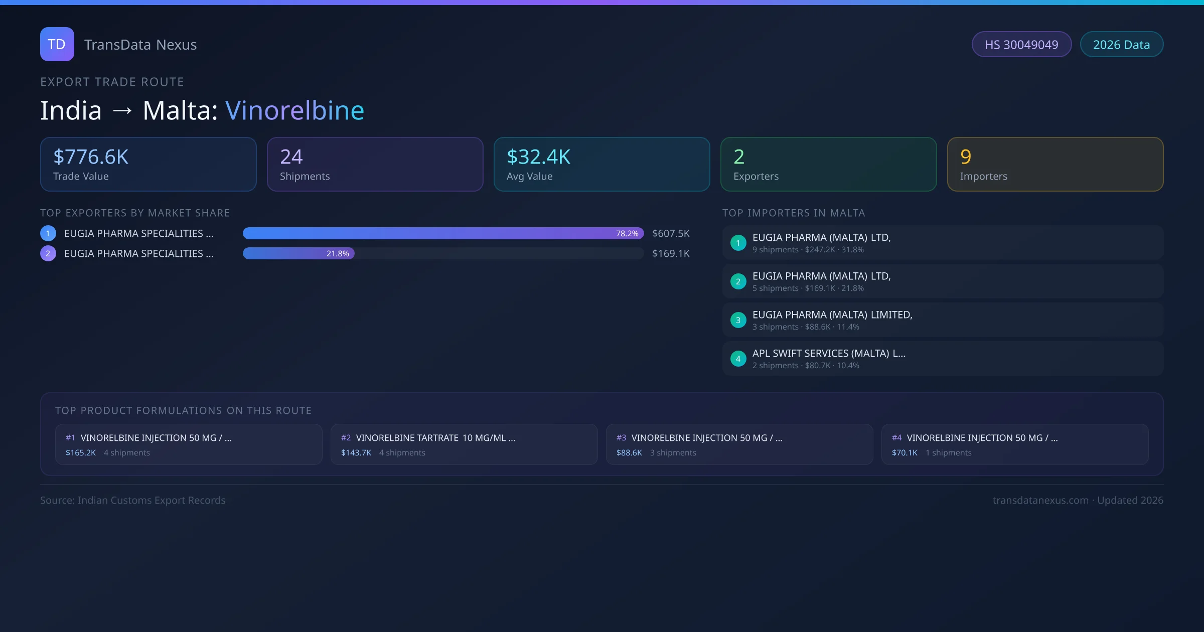 - 1.Route Identification: India to Malta export trade corridor identified from Indian Customs (DGFT) records for Vinorelbine.