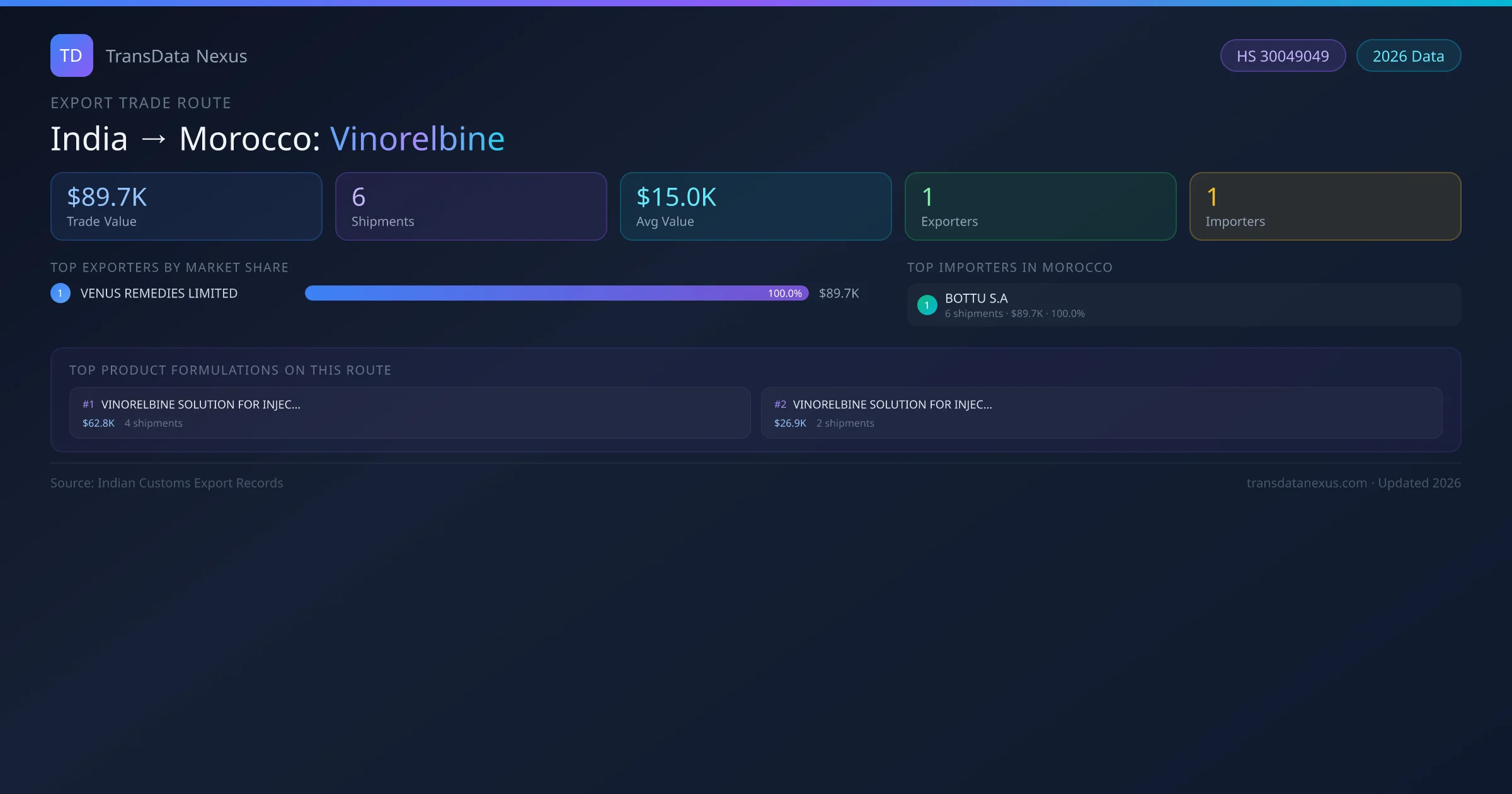 The India to Morocco Vinorelbine corridor is one of India's established pharmaceutical export routes, with 6 shipments documented worth a combined $89.7K USD. The route is dominated by VENUS REMEDIES LIMITED , which alone accounts for roughly 100% of all export value, reflecting the consolidated nature of India's vinorelbine manufacturing sector.