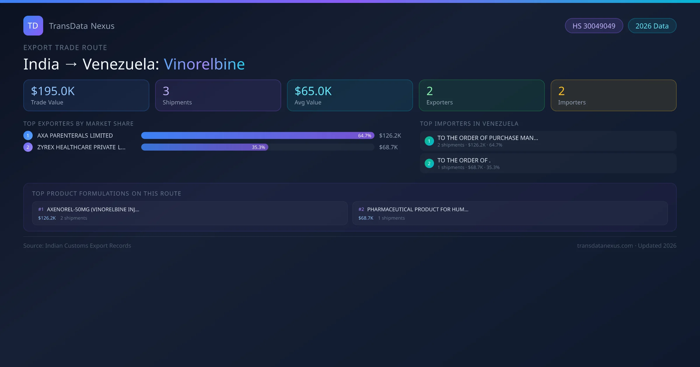 The India to Venezuela Vinorelbine corridor is one of India's established pharmaceutical export routes, with 3 shipments documented worth a combined $195.0K USD. The route is dominated by AXA PARENTERALS LIMITED , which alone accounts for roughly 65% of all export value, reflecting the consolidated nature of India's vinorelbine manufacturing sector.