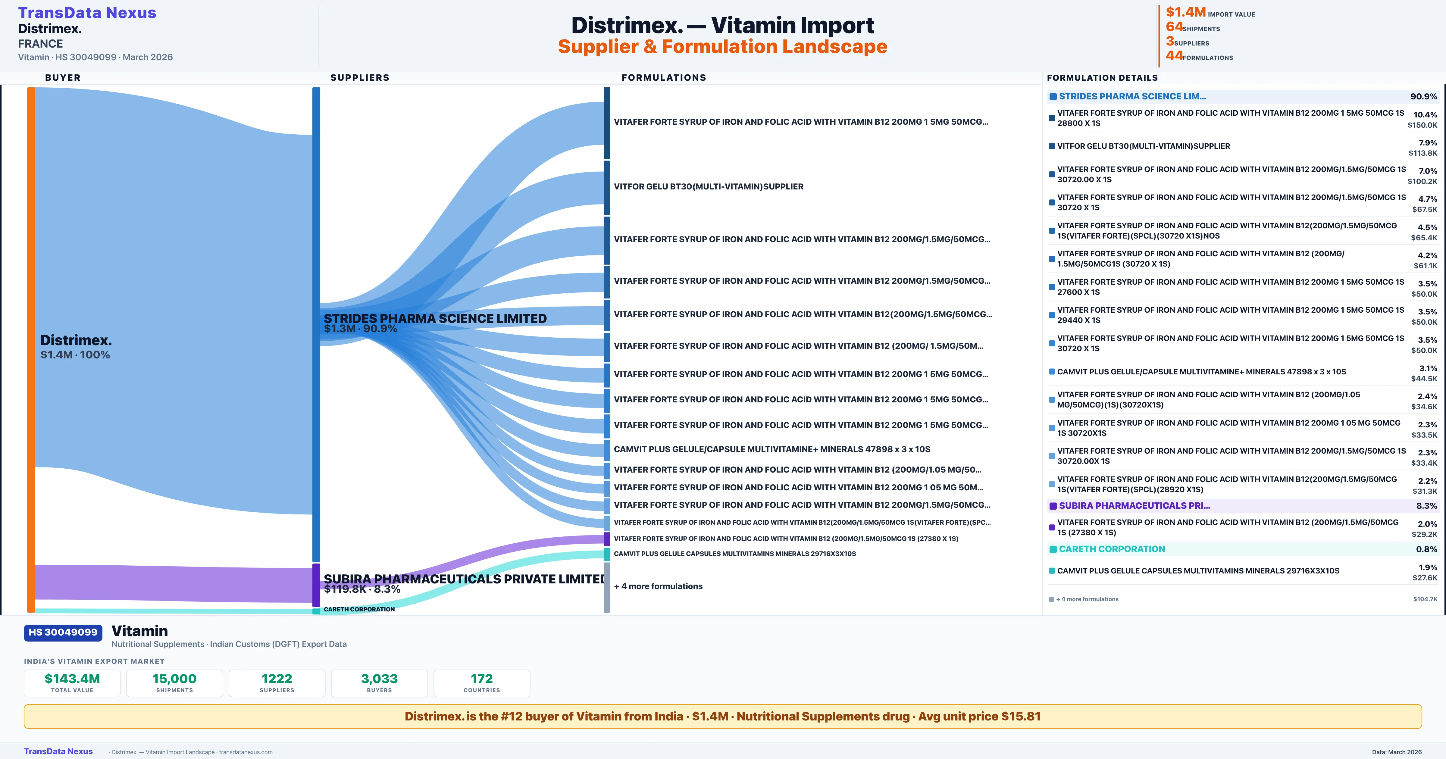 DISTRIMEX sources Vitamin from 3 verified Indian suppliers: STRIDES PHARMA SCIENCE LIMITED ($1.3M, 90.9%), SUBIRA PHARMACEUTICALS PRIVATE LIMITED ($119.8K, 8.3%), CARETH CORPORATION ($11.4K, 0.8%). This is based on 64 customs records.
