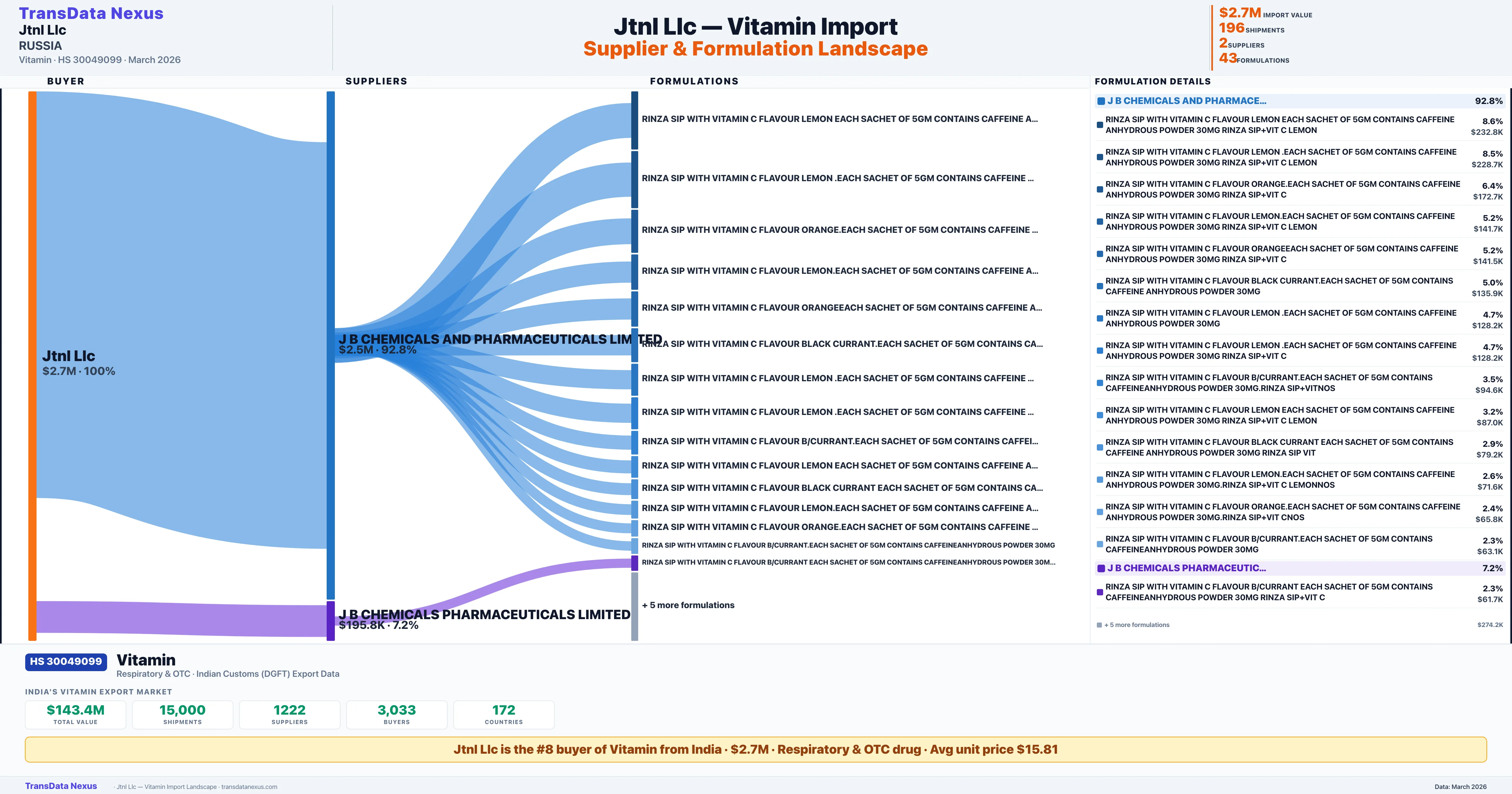 JTNL LLC sources Vitamin from 2 verified Indian suppliers: J B CHEMICALS AND PHARMACEUTICALS LIMITED ($2.5M, 92.8%), J B CHEMICALS PHARMACEUTICALS LIMITED ($195.8K, 7.2%). This is based on 196 customs records.