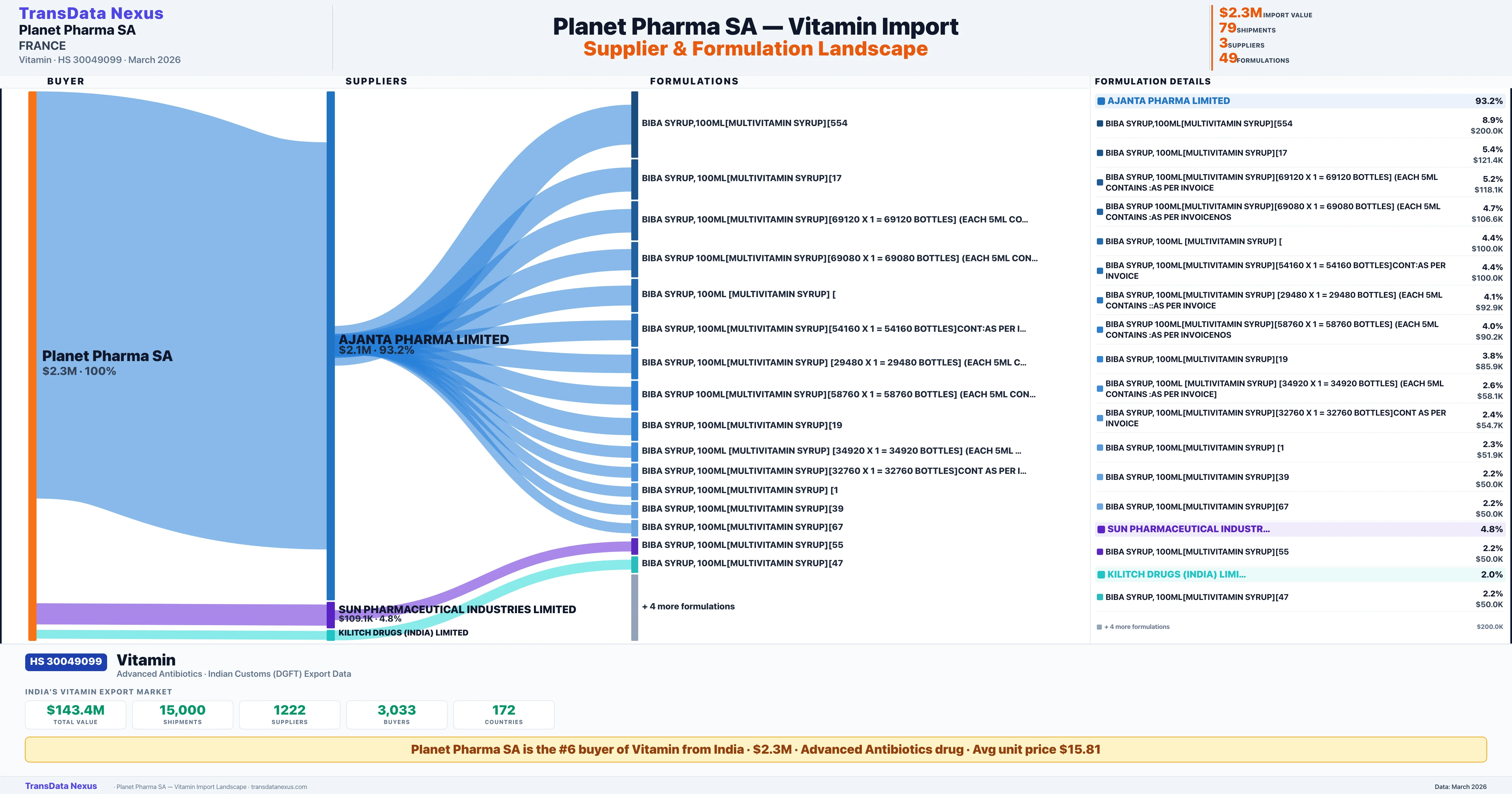 PLANET PHARMA SA sources Vitamin from 3 verified Indian suppliers: AJANTA PHARMA LIMITED ($2.1M, 93.2%), SUN PHARMACEUTICAL INDUSTRIES LIMITED ($109.1K, 4.8%), KILITCH DRUGS (INDIA) LIMITED ($45.4K, 2.0%). This is based on 79 customs records.