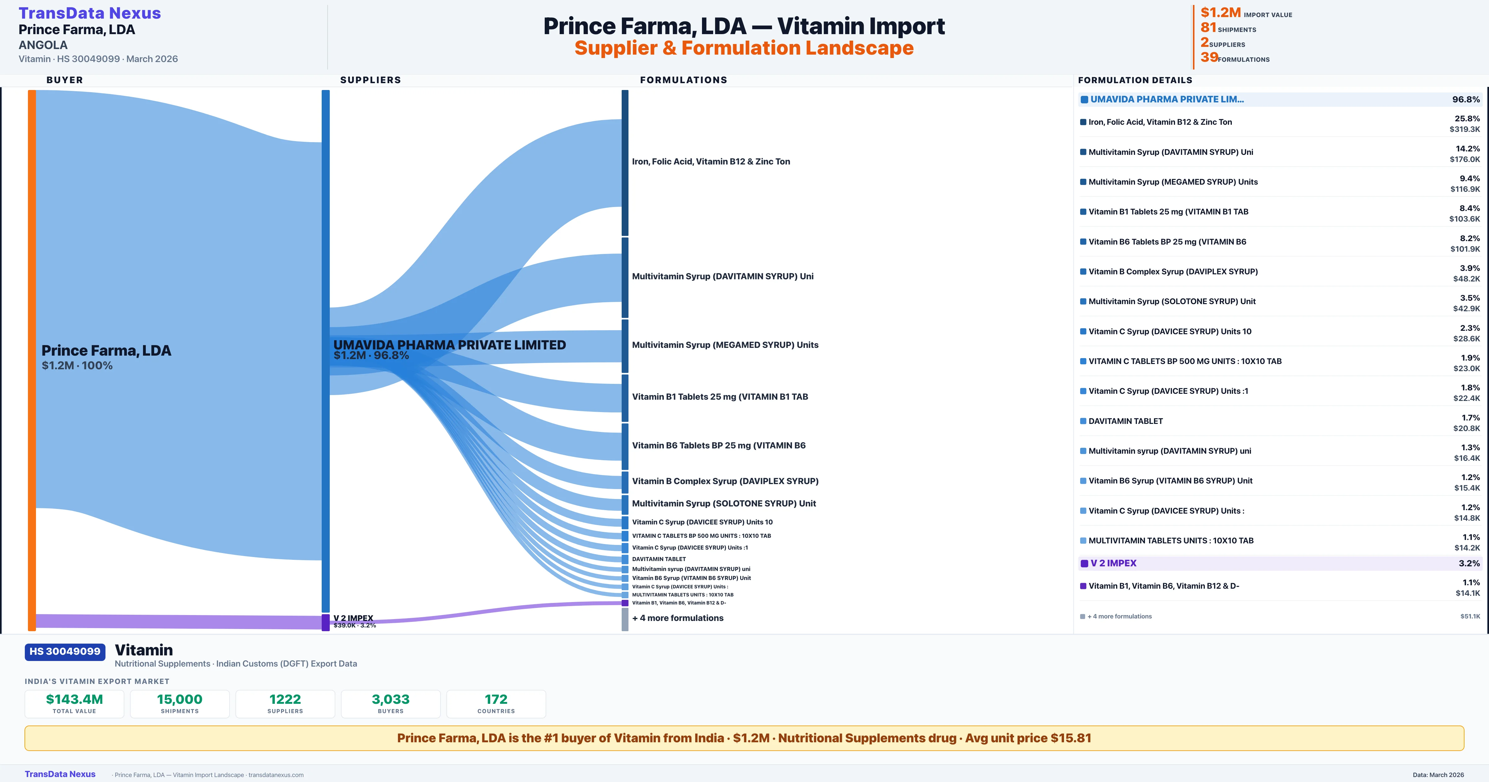 PRINCE FARMA, LDA sources Vitamin from 2 verified Indian suppliers: UMAVIDA PHARMA PRIVATE LIMITED ($1.2M, 96.8%), V 2 IMPEX ($39.0K, 3.2%). This is based on 81 customs records.