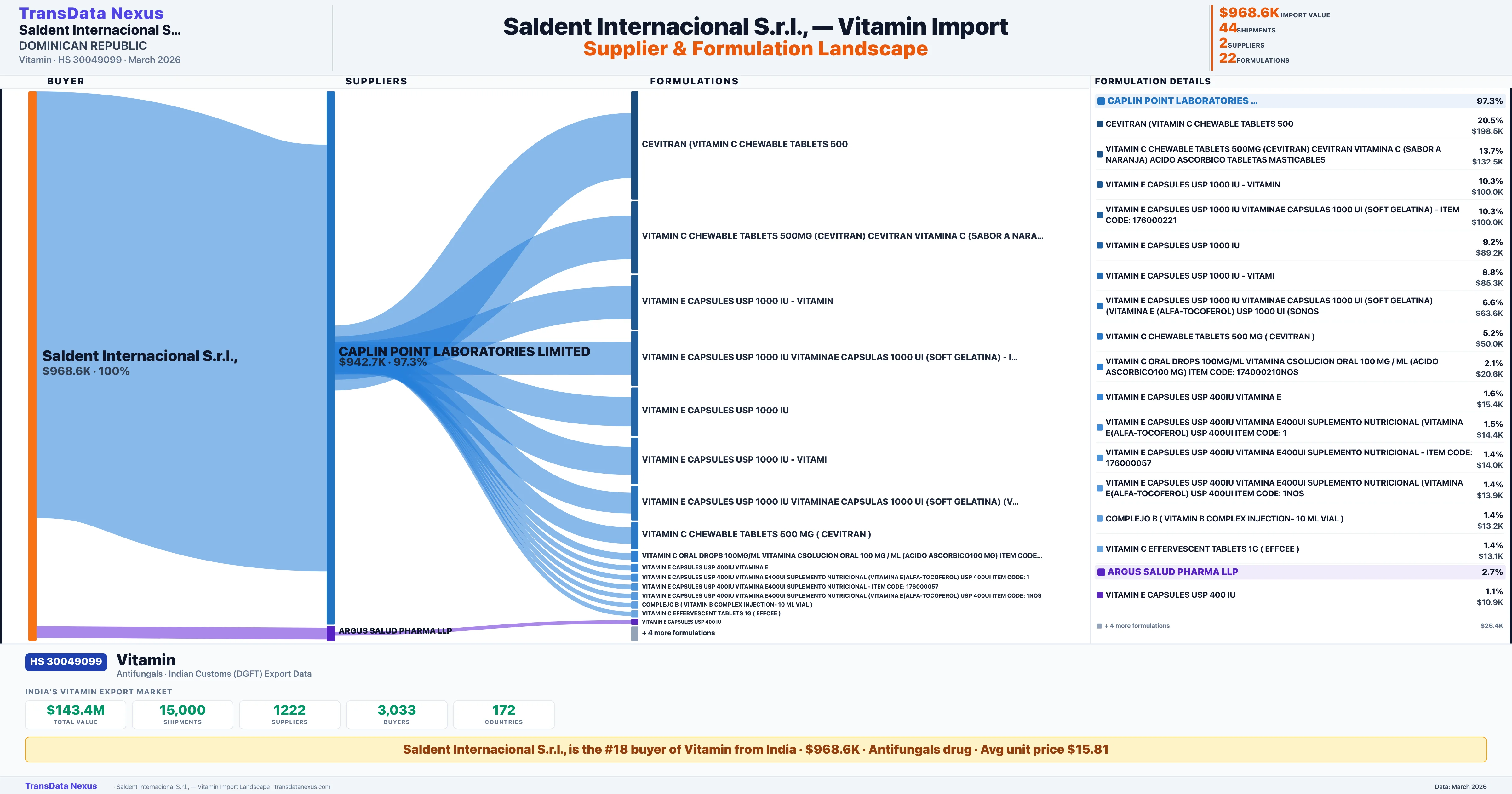 SALDENT INTERNACIONAL S.R.L., sources Vitamin from 2 verified Indian suppliers: CAPLIN POINT LABORATORIES LIMITED ($942.7K, 97.3%), ARGUS SALUD PHARMA LLP ($25.9K, 2.7%). This is based on 44 customs records.