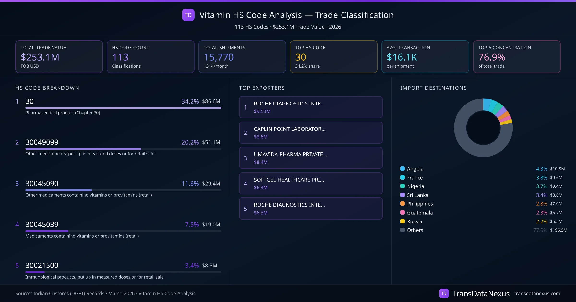 India exports Vitamin under 113 distinct HS code classifications, representing a total trade value of $253.1M across 15,770 shipments. The dominant classification is HS 30 (Pharmaceutical product (Chapter 30)), accounting for 34.2% of all Vitamin trade at $86.6M. HS 30049099 (Other medicaments, put up in measured doses or for retail sale) follows at 20.2% ($51.1M). The top 5 HS codes together account for 76.9% of total Vitamin trade from India. The average transaction value is $16051. Key importing markets include Angola, France, Nigeria. Leading exporters include ROCHE DIAGNOSTICS INTERNATIONAL LTD and CAPLIN POINT LABORATORIES LIMITED. Data sourced from Indian Customs (DGFT) shipping bill records.