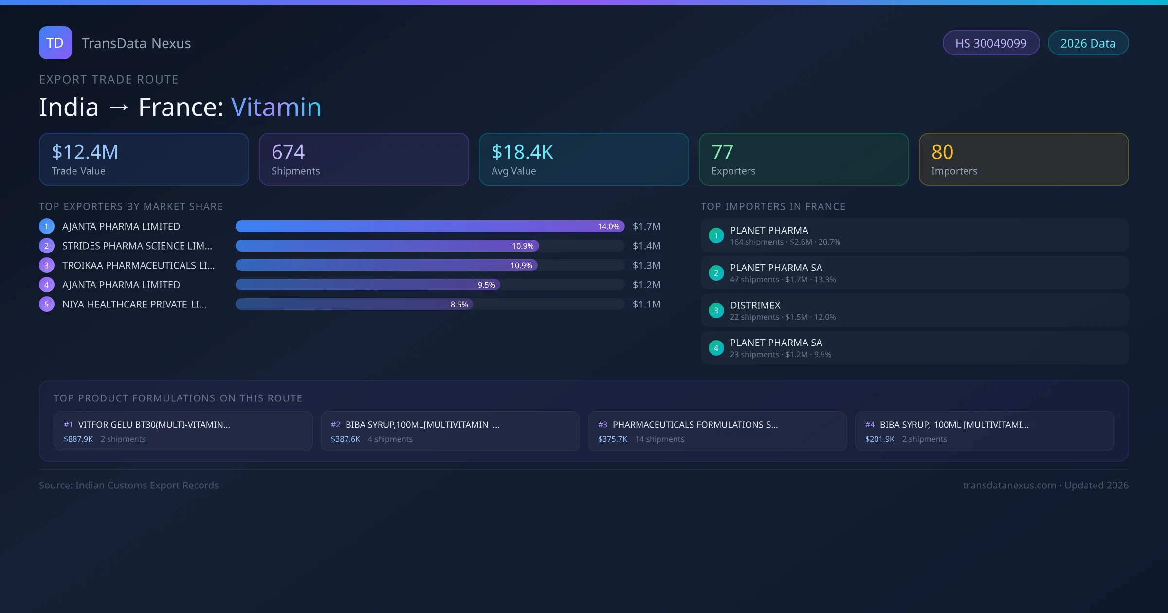 India has recorded 674 verified shipments of Vitamin exported to France, representing a combined trade value of $12.4M USD. This corridor is served by 77 active Indian exporters, with an average shipment value of $18.4K USD. The leading Indian exporter is AJANTA PHARMA LIMITED, which accounts for 14% of total export value with 49 shipments worth $1.7M USD. On the buying side, PLANET PHARMA is the largest importer in France with $2.6M USD in purchases. The top 3 suppliers — AJANTA PHARMA LIMITED, STRIDES PHARMA SCIENCE LIMITED, TROIKAA PHARMACEUTICALS LIMITED — together control 36% of total trade value on this route. All data sourced from Indian Customs (DGFT) shipping bill records. Values reported in FOB USD.