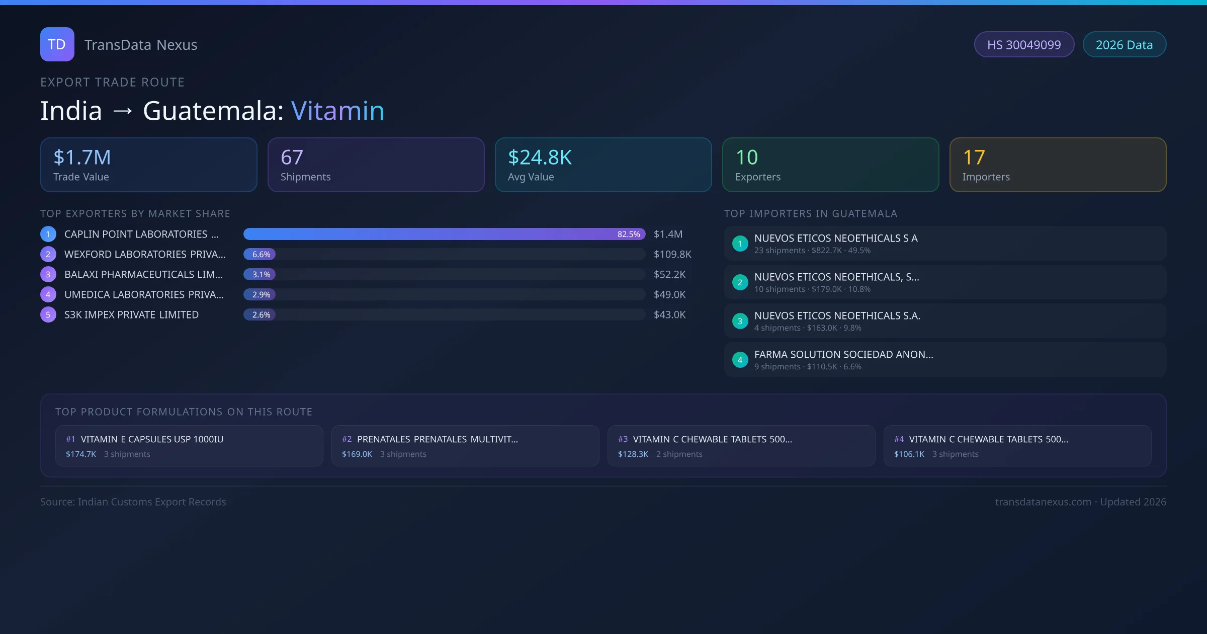 - 1.Route Identification: India to Guatemala export trade corridor identified from Indian Customs (DGFT) records for Vitamin.