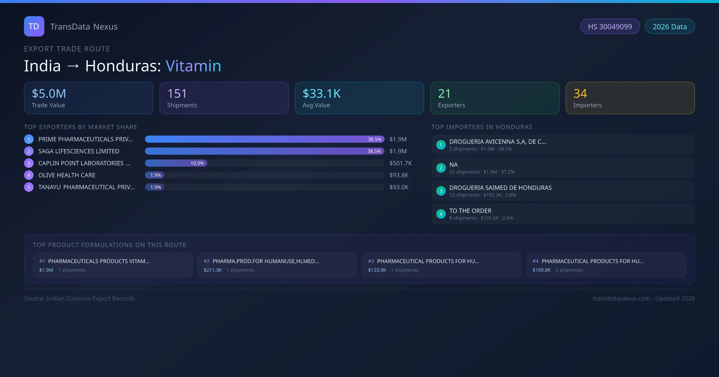 The leading Indian exporters of Vitamin to Honduras are PRIME PHARMACEUTICALS PRIVATE LIMITED, SAGA LIFESCIENCES LIMITED, CAPLIN POINT LABORATORIES LIMITED. PRIME PHARMACEUTICALS PRIVATE LIMITED holds the largest market share at approximately 39% of total trade value on this route.