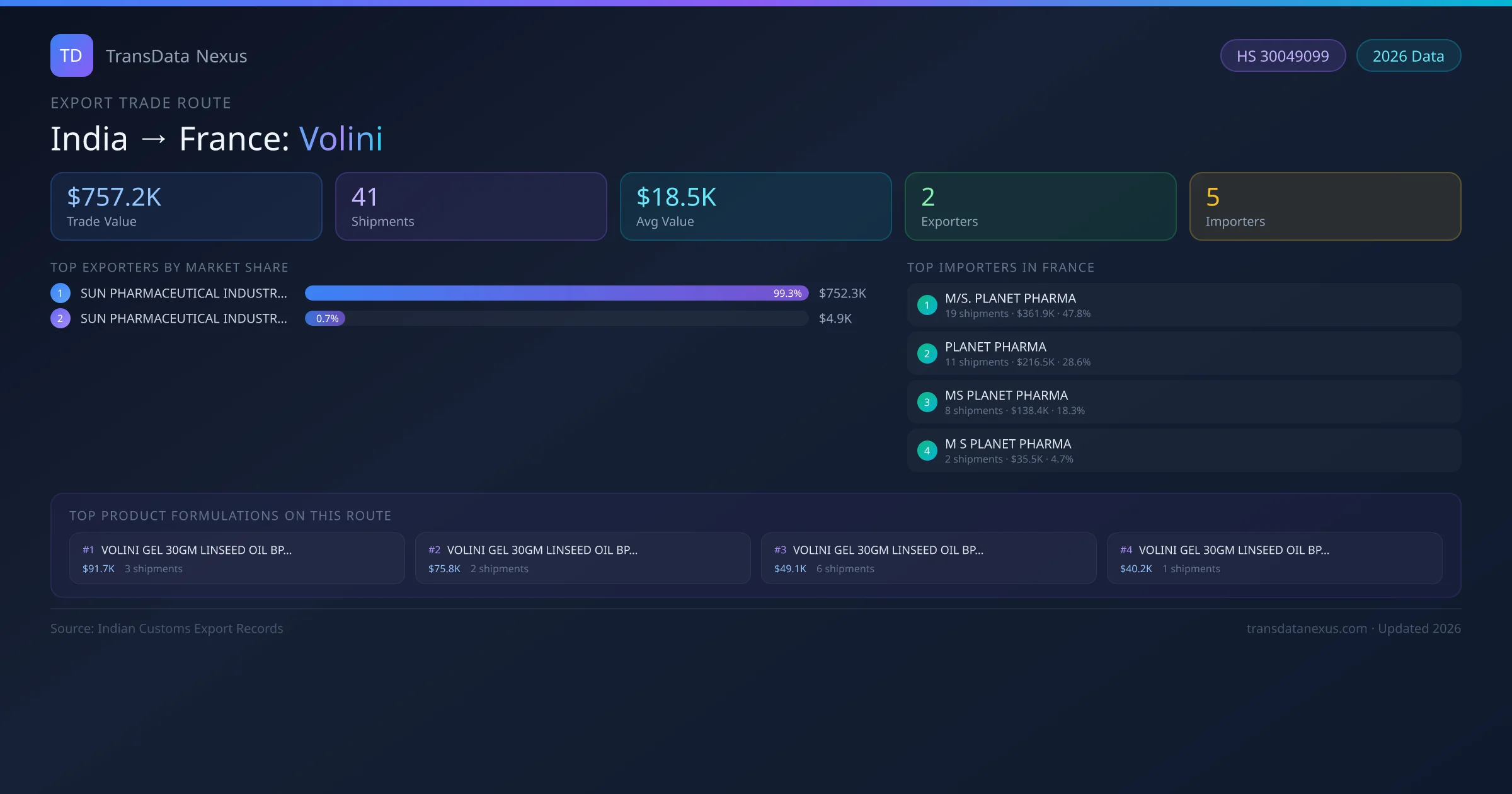 India has recorded 41 verified shipments of Volini exported to France, representing a combined trade value of $757.2K USD. This corridor is served by 2 active Indian exporters, with an average shipment value of $18.5K USD. The leading Indian exporter is SUN PHARMACEUTICAL INDUSTRIES LIMITED, which accounts for 99% of total export value with 40 shipments worth $752.3K USD. On the buying side, M/S. PLANET PHARMA is the largest importer in France with $361.9K USD in purchases. All data sourced from Indian Customs (DGFT) shipping bill records. Values reported in FOB USD.