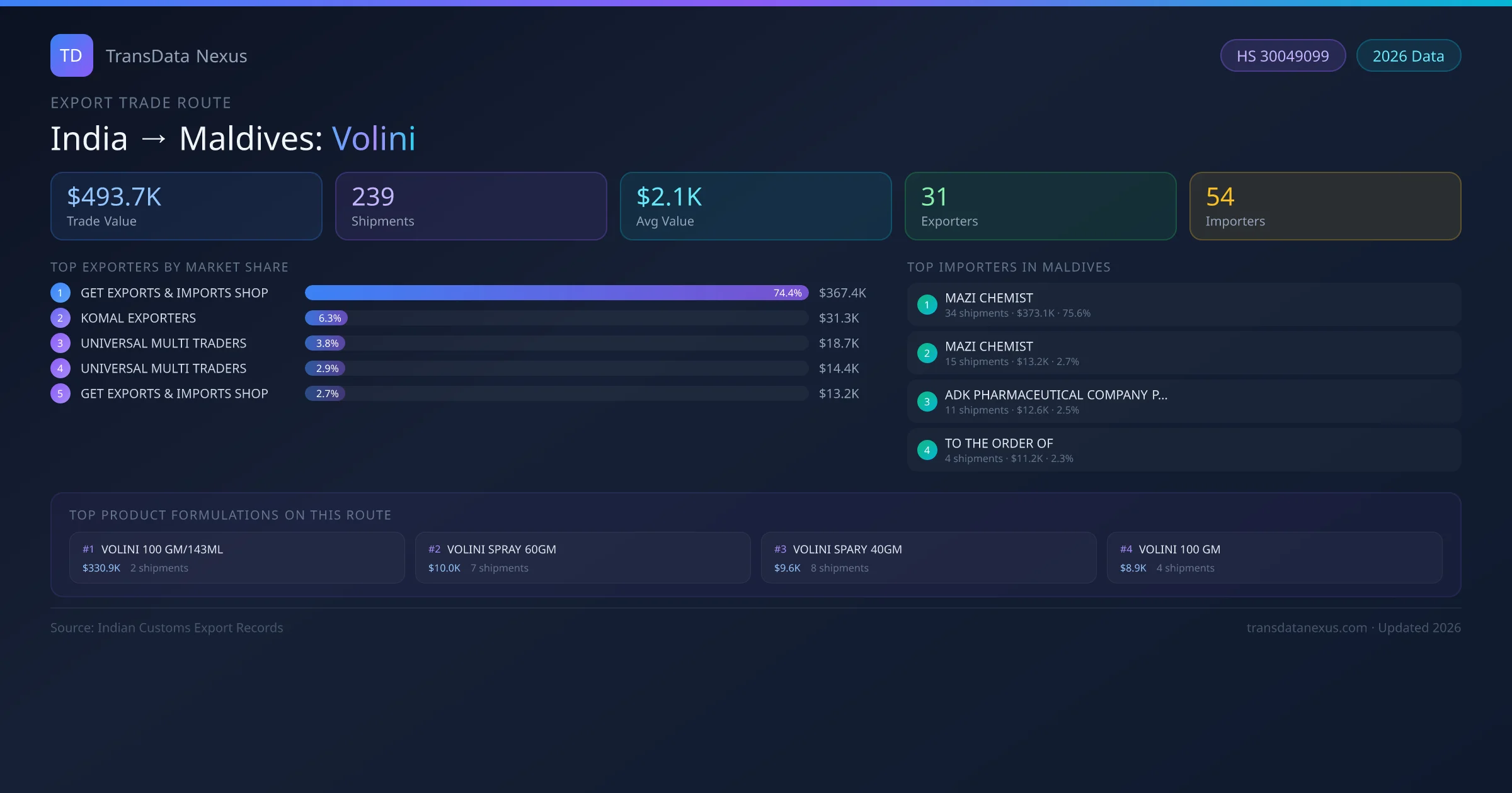 The India to Maldives Volini corridor is one of India's established pharmaceutical export routes, with 239 shipments documented worth a combined $493.7K USD. The route is dominated by GET EXPORTS & IMPORTS SHOP, which alone accounts for roughly 74% of all export value, reflecting the consolidated nature of India's volini manufacturing sector.