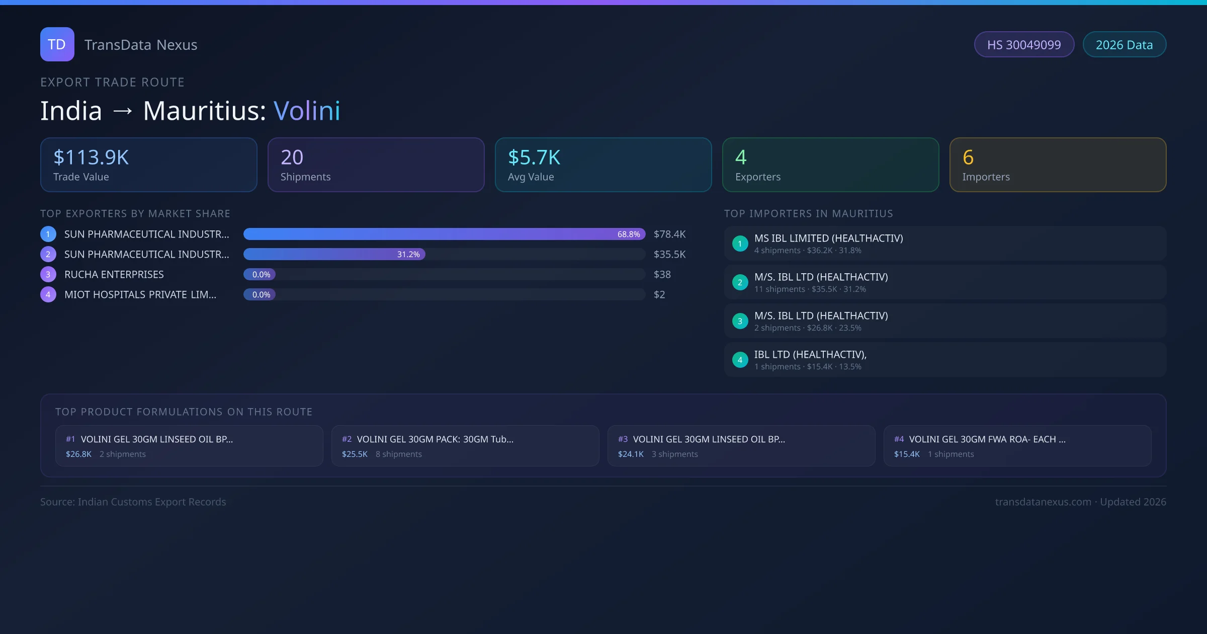 India has recorded 20 verified shipments of Volini exported to Mauritius, representing a combined trade value of $113.9K USD. This corridor is served by 4 active Indian exporters, with an average shipment value of $5.7K USD. The leading Indian exporter is SUN PHARMACEUTICAL INDUSTRIES LIMITED, which accounts for 69% of total export value with 7 shipments worth $78.4K USD. On the buying side, MS IBL LIMITED (HEALTHACTIV) is the largest importer in Mauritius with $36.2K USD in purchases. The top 3 suppliers — SUN PHARMACEUTICAL INDUSTRIES LIMITED, SUN PHARMACEUTICAL INDUSTRIES LIMITED , RUCHA ENTERPRISES — together control 100% of total trade value on this route. All data sourced from Indian Customs (DGFT) shipping bill records. Values reported in FOB USD.