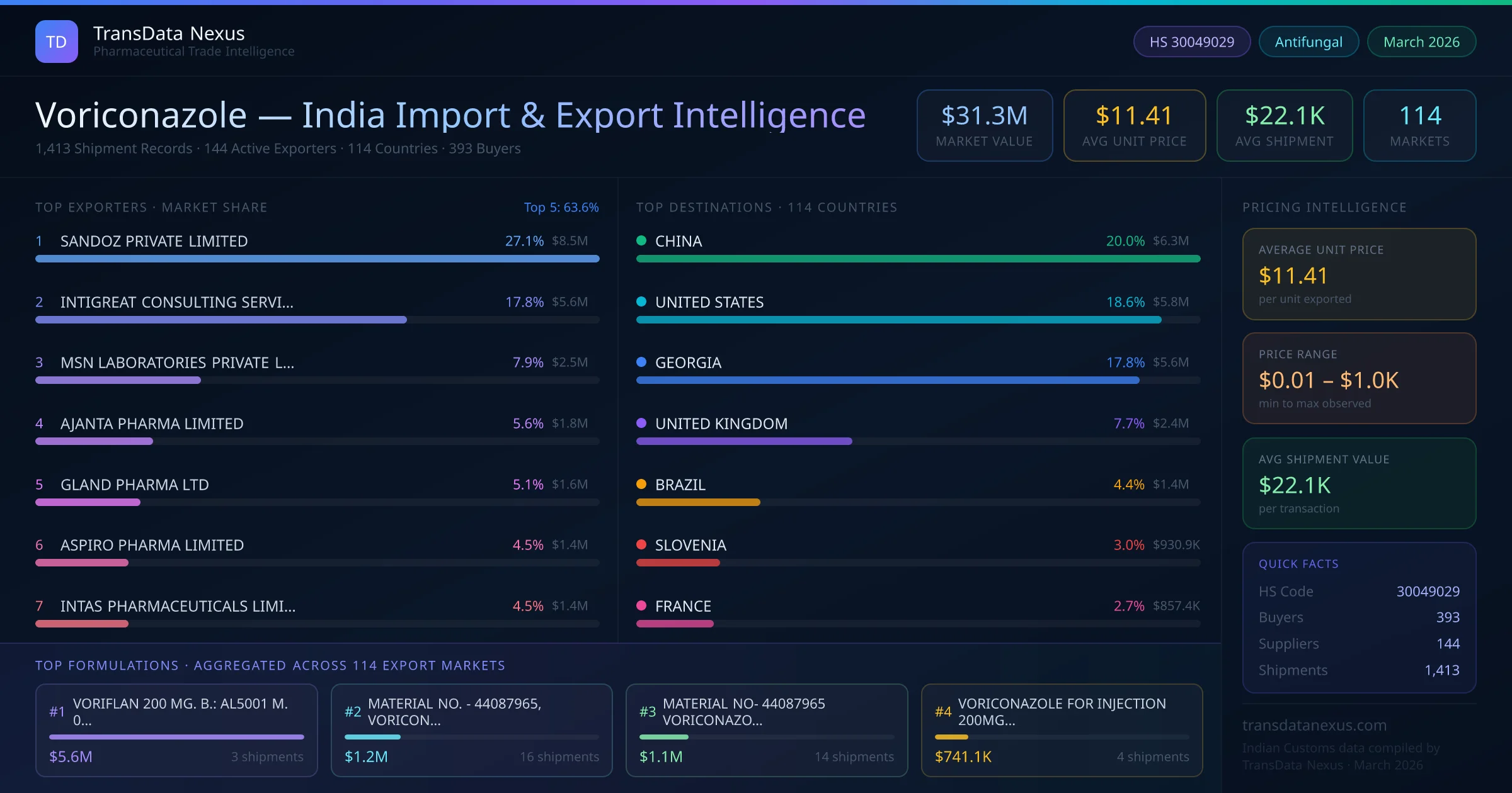 The average unit price for voriconazole exports from India is $11.41 per unit, with prices ranging from $0.01 to $1001.82 depending on formulation and order volume.