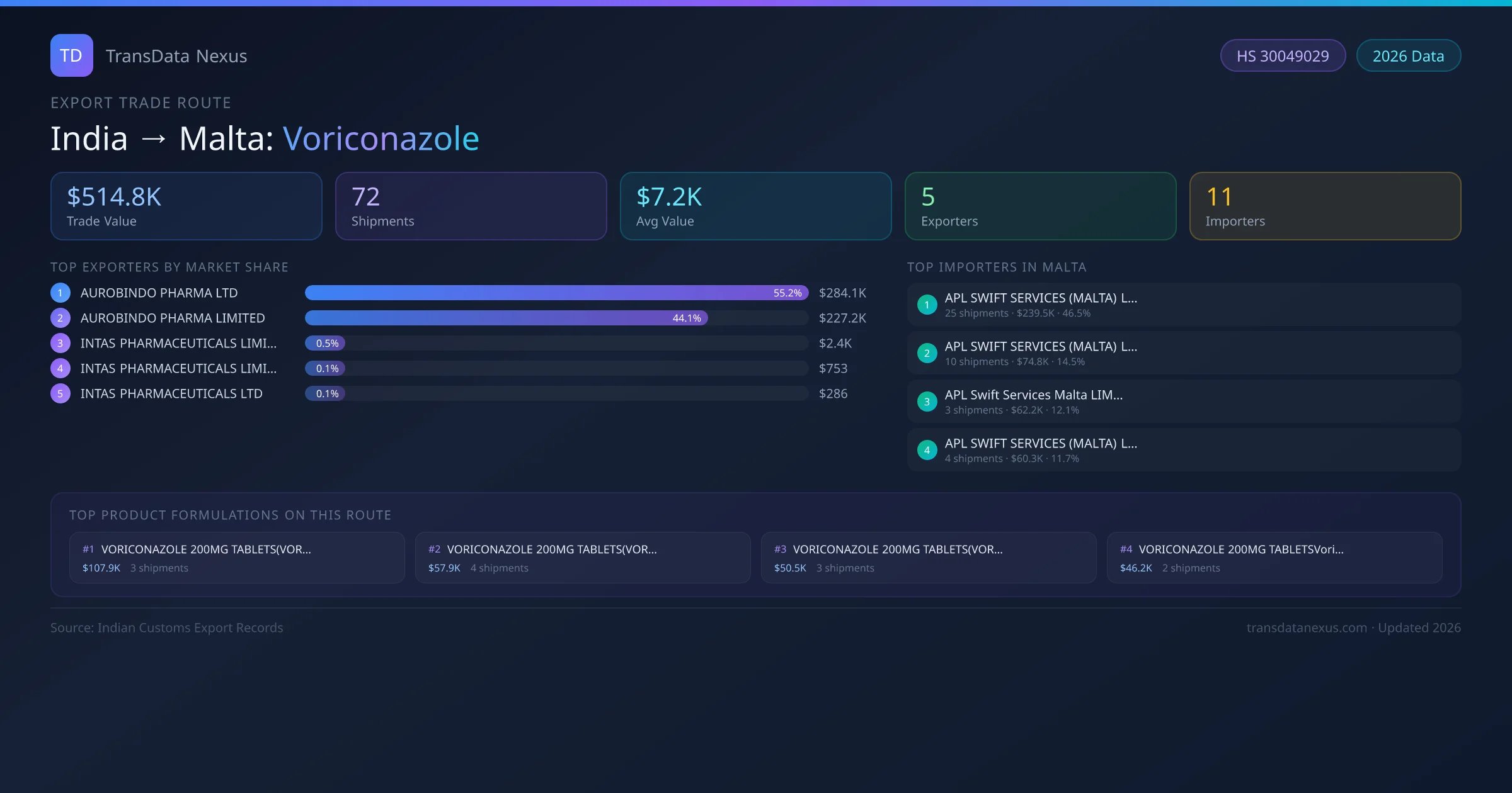 India has recorded 72 verified shipments of Voriconazole exported to Malta, representing a combined trade value of $514.8K USD. This corridor is served by 5 active Indian exporters, with an average shipment value of $7.2K USD. The leading Indian exporter is AUROBINDO PHARMA LTD, which accounts for 55% of total export value with 28 shipments worth $284.1K USD. On the buying side, APL SWIFT SERVICES (MALTA) LTD., is the largest importer in Malta with $239.5K USD in purchases. The top 3 suppliers — AUROBINDO PHARMA LTD, AUROBINDO PHARMA LIMITED, INTAS PHARMACEUTICALS LIMITED — together control 100% of total trade value on this route. All data sourced from Indian Customs (DGFT) shipping bill records. Values reported in FOB USD.
