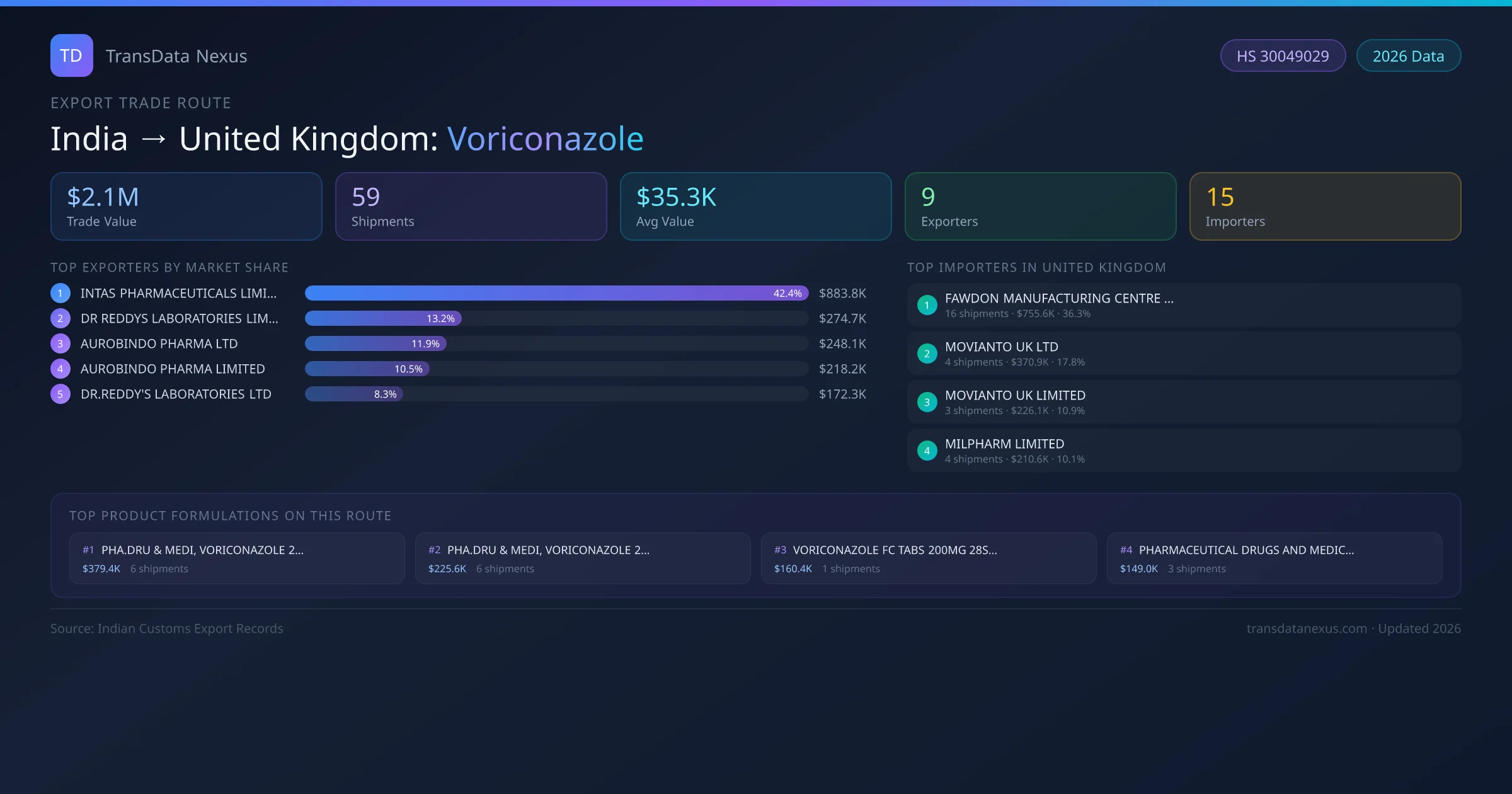 The leading Indian exporters of Voriconazole to United Kingdom are INTAS PHARMACEUTICALS LIMITED, DR REDDYS LABORATORIES LIMITED, AUROBINDO PHARMA LTD. INTAS PHARMACEUTICALS LIMITED holds the largest market share at approximately 42% of total trade value on this route.