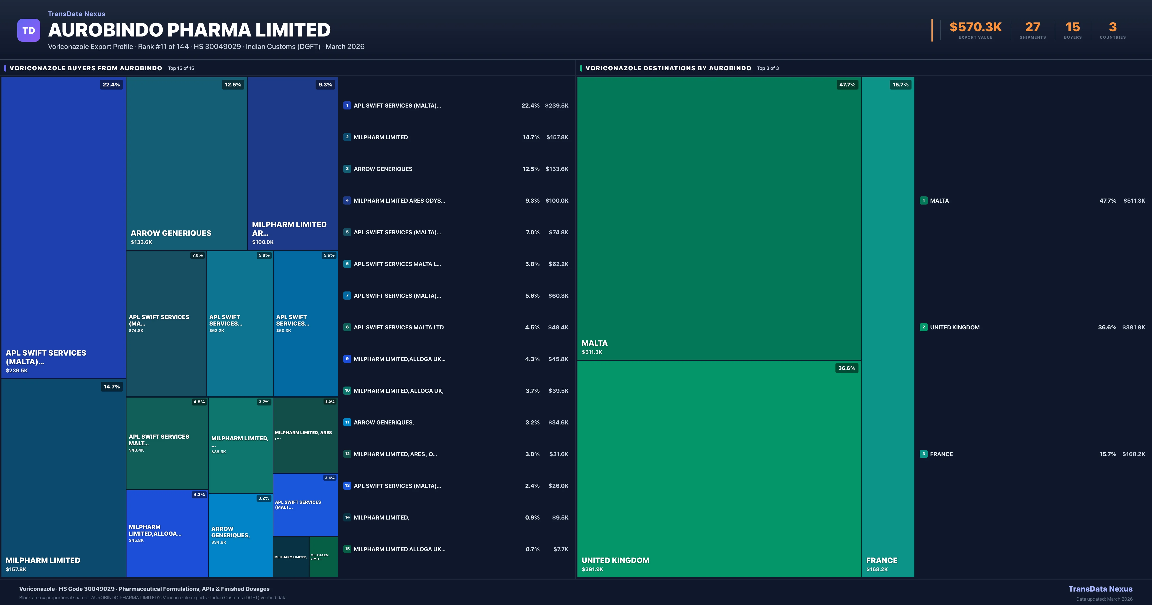 Aurobindo Pharma Limited supplies Voriconazole to 15 buyers globally. The largest buyer is APL SWIFT SERVICES (MALTA) LTD., (MALTA), followed by MILPHARM LIMITED (UNITED KINGDOM) and ARROW GENERIQUES (FRANCE). These buyers represent pharmaceutical distributors, hospital groups, and government procurement agencies in their respective markets.